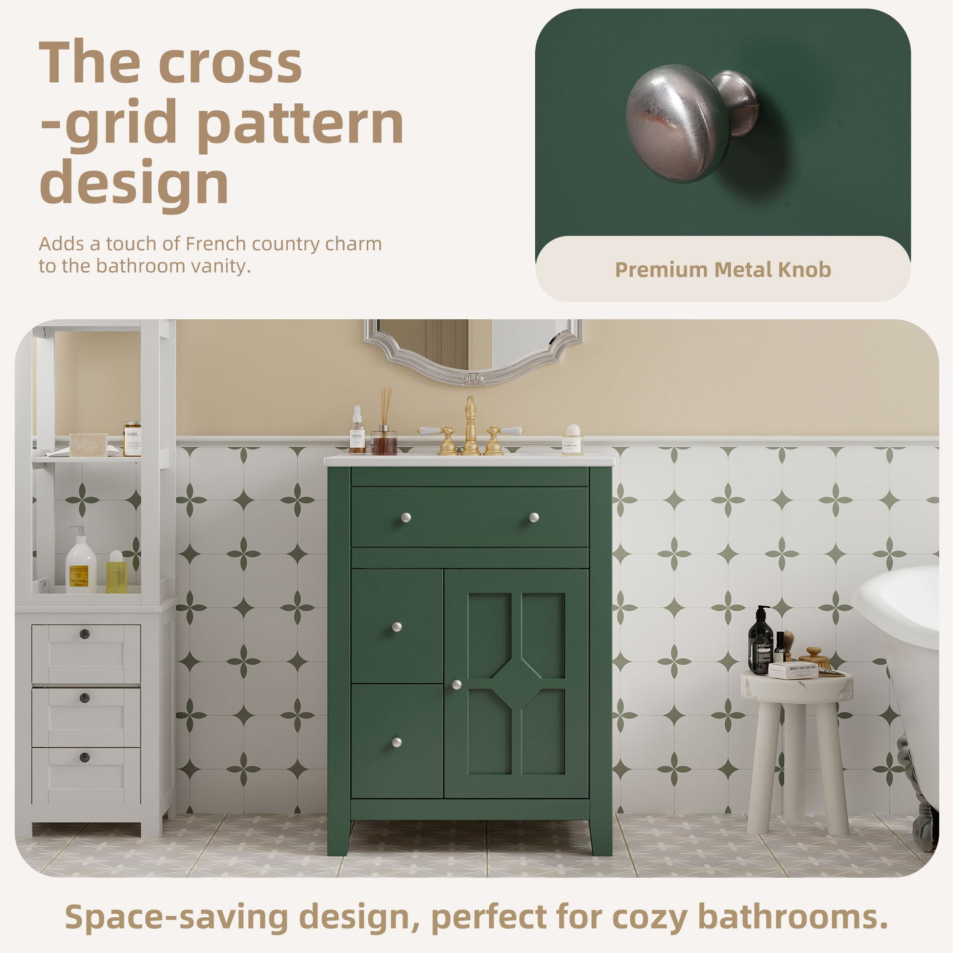 - Elegant French Country Design: Features a delicate cross-grid pattern and premium metal knobs for a sophisticated, rustic-inspired look that complements various bathroom styles.