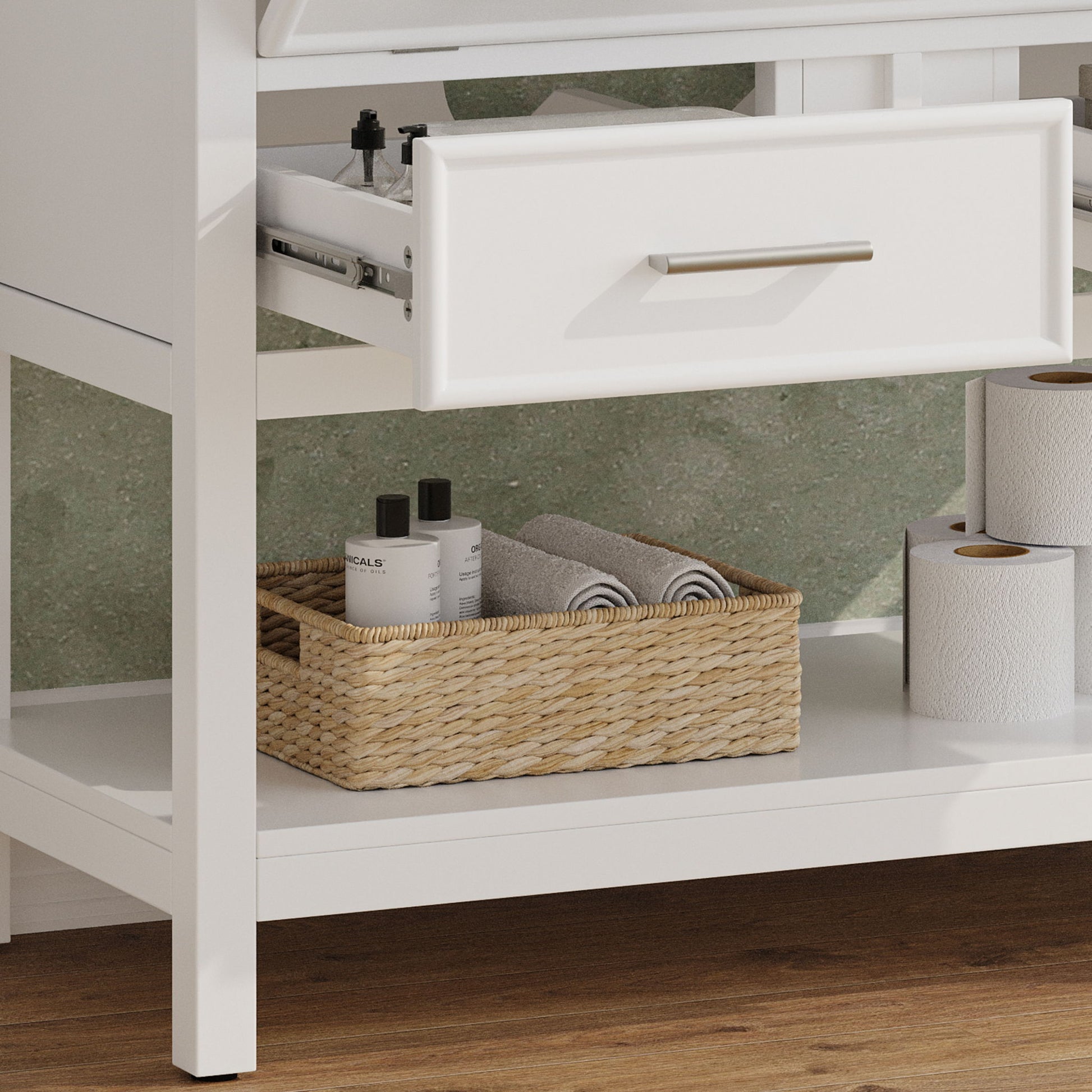 - Smart Storage Layout: Combines a tip-out tray, two full-extension drawers, and an open bottom shelf for organized access to daily essentials and decorative items.