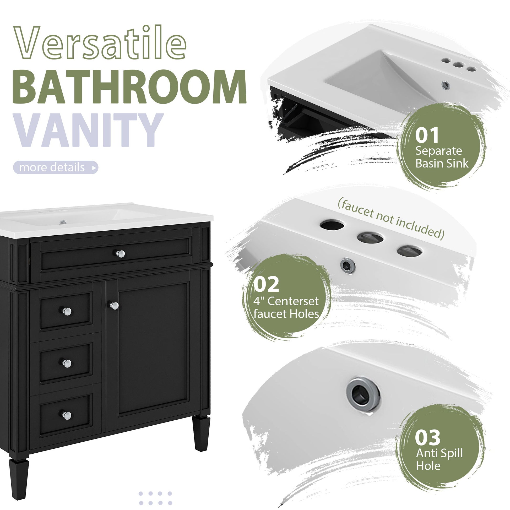 - Ample Storage: The vanity provides generous space for toiletries and essentials. It combines cabinet body and drawers for organized storage, protecting items from water stains and dust with soft-close doors and water-resistant paint for durability.