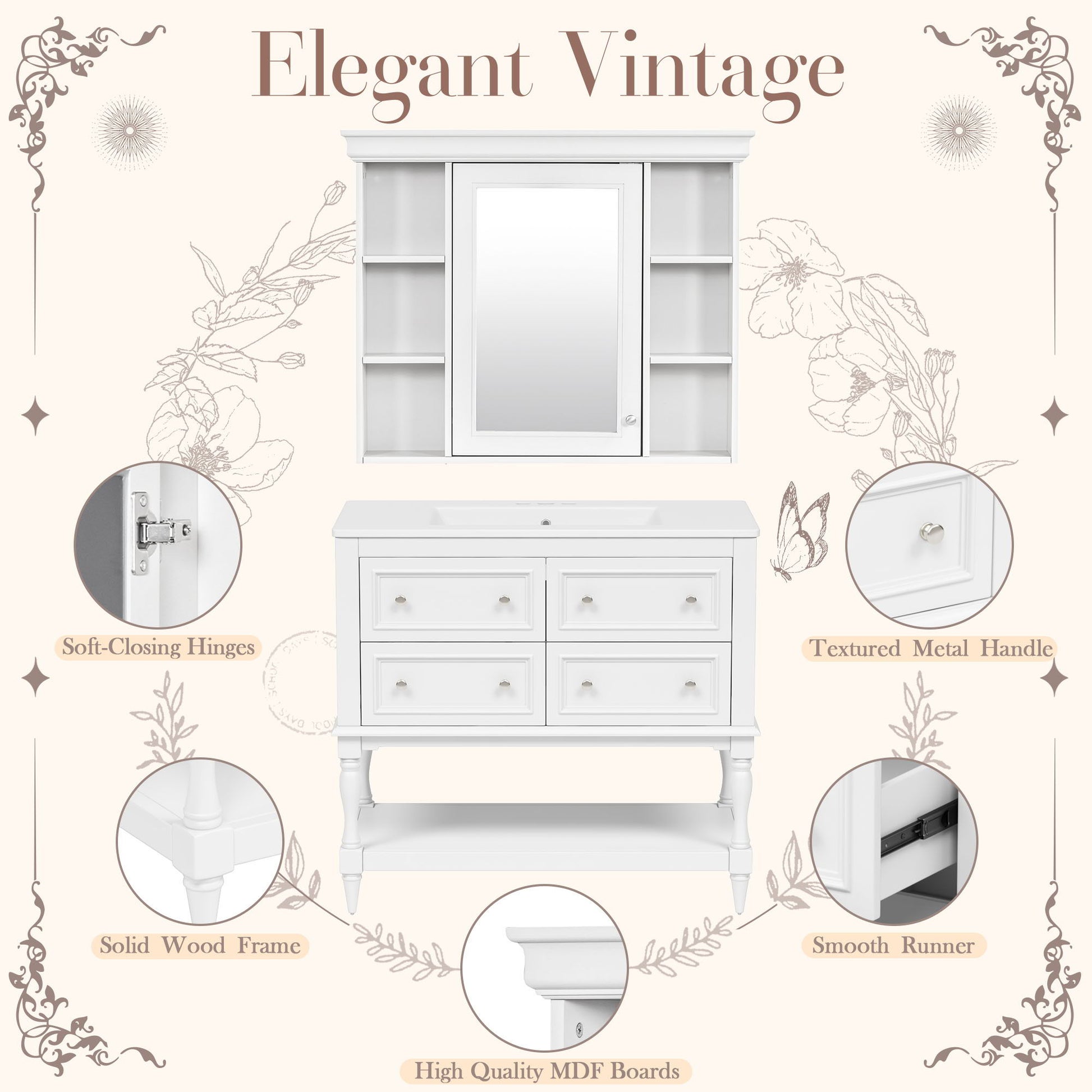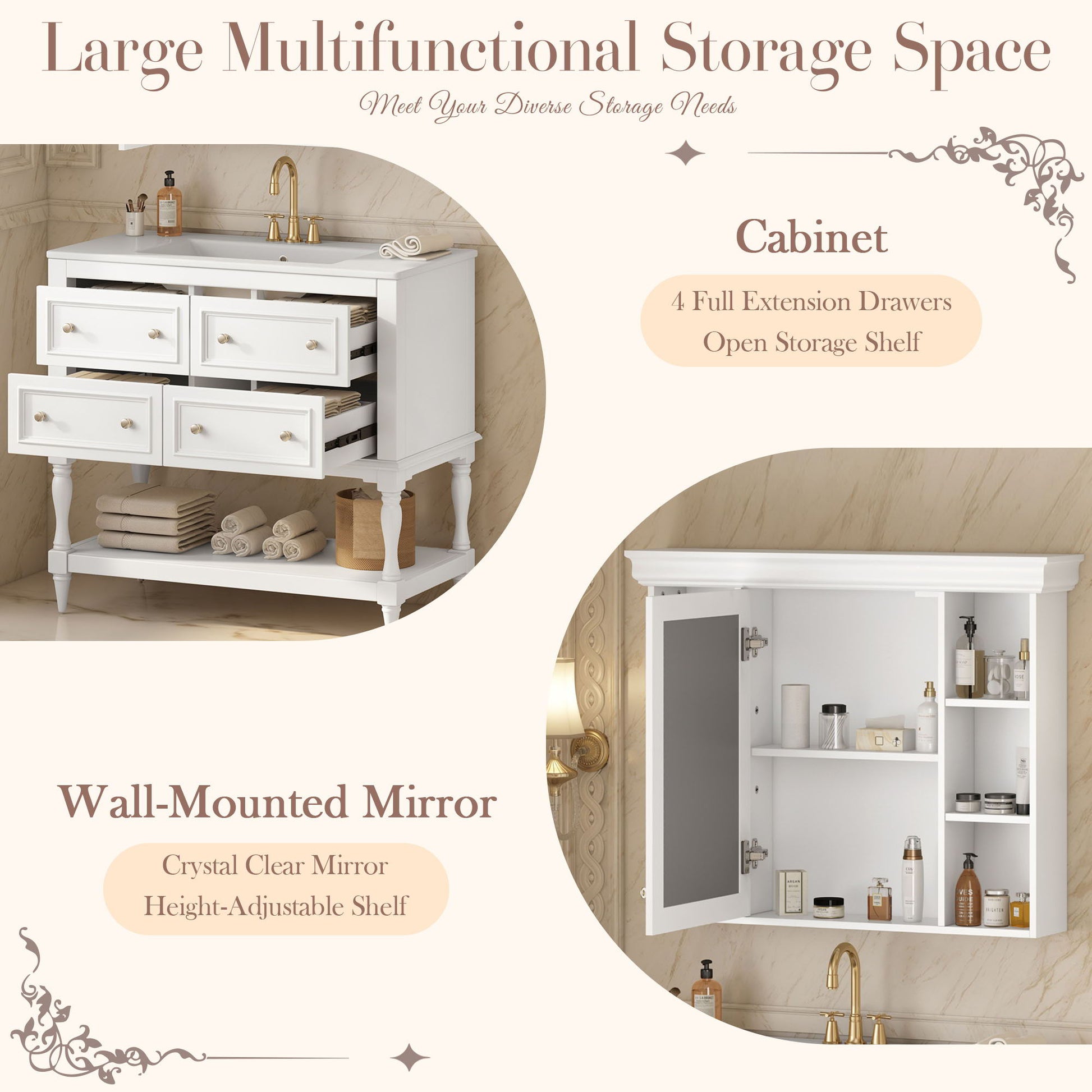 36" Bathroom Vanity With Medicine Cabinet, Storage Cabinet With 4 Drawers, Adjustable Shelf - White