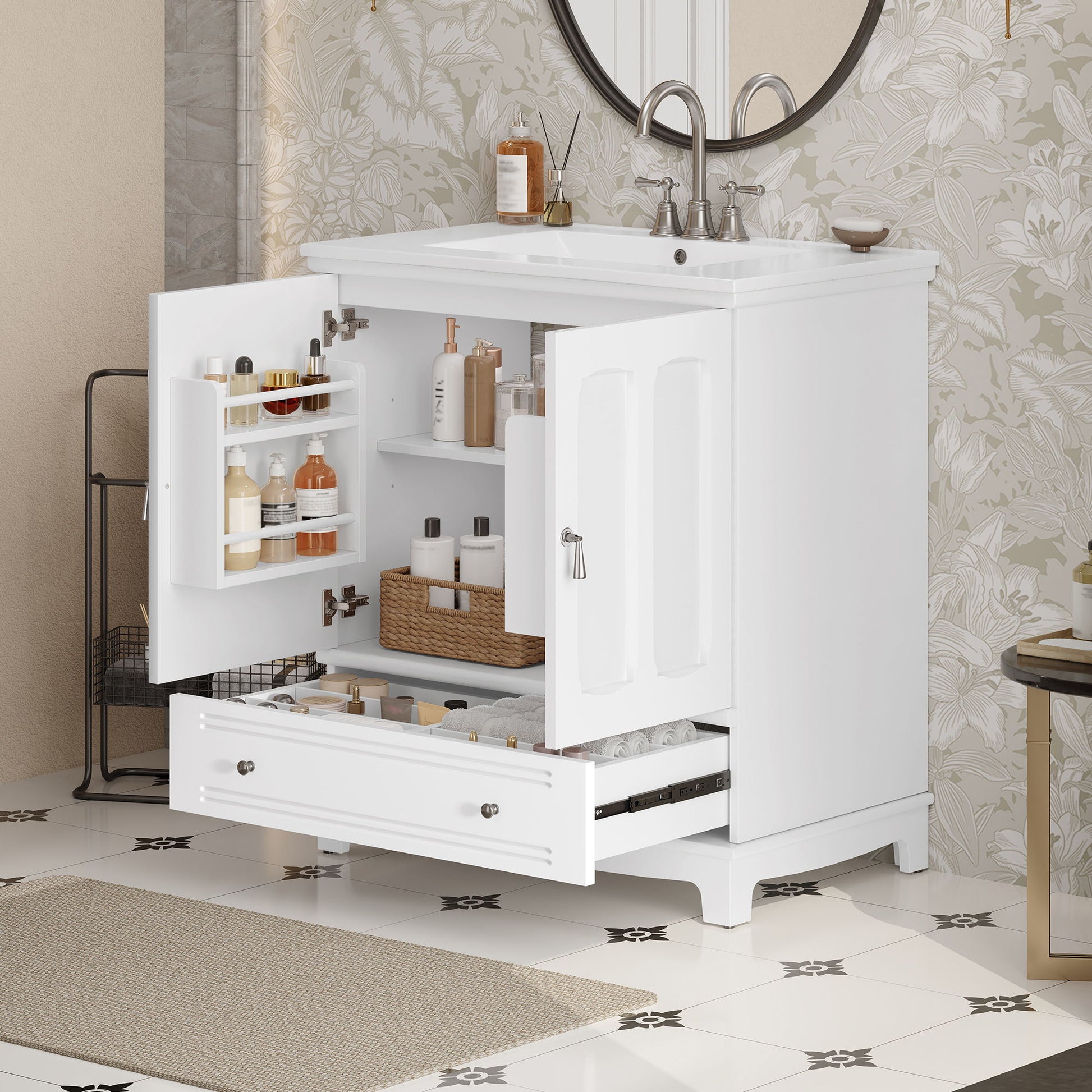- Spacious Storage: Includes a large drawer with divider and hidden cabinet space for organizing cleaning supplies and bath essentials.