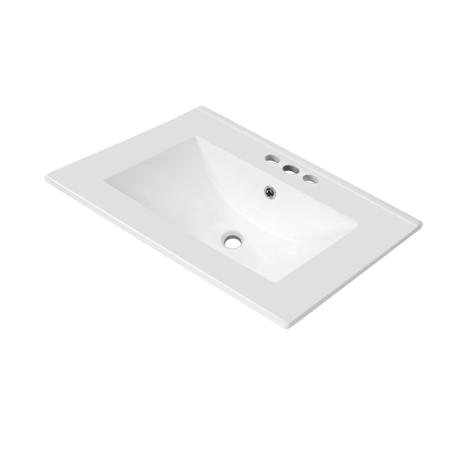 - Ceramic Sink: Easy-to-clean sink with water stain resistance, pre-drilled for 4" widespread faucets (not included) and features a chrome-finish overflow.