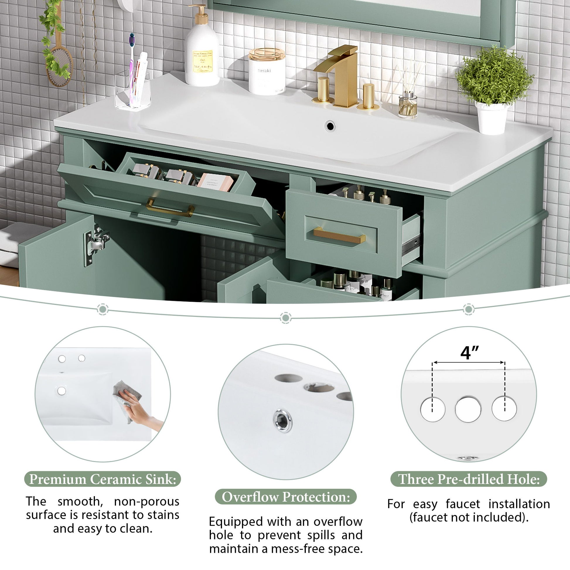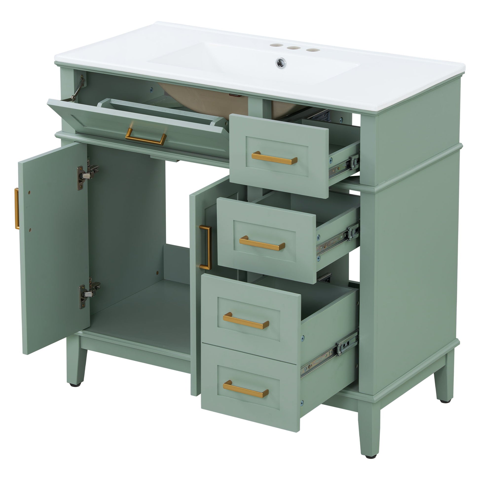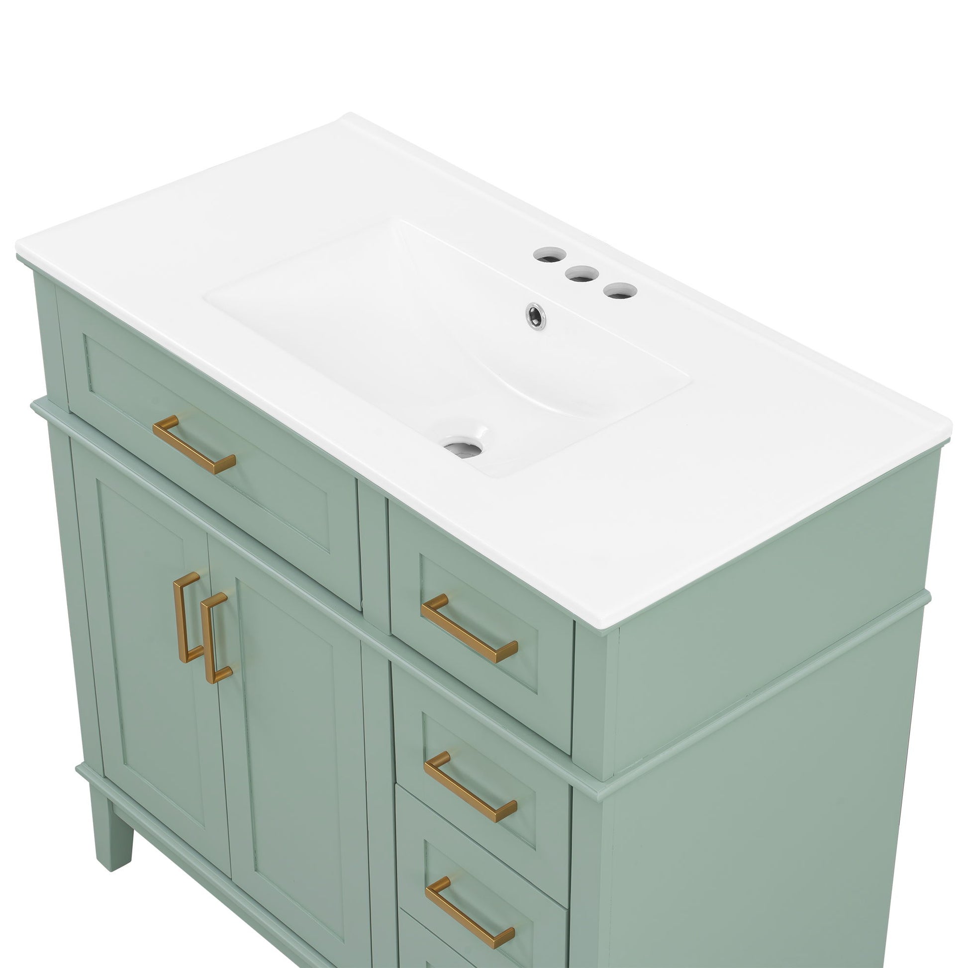 36" Light Bathroom Vanity With Sink, Soft Close Doors, 4 Storage Drawers - Light Green