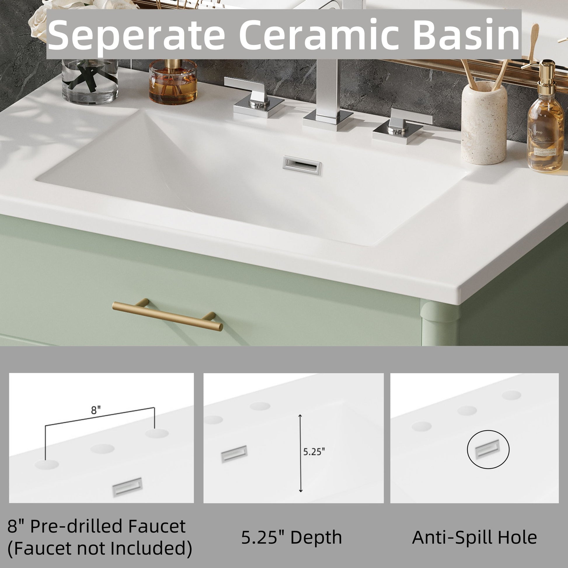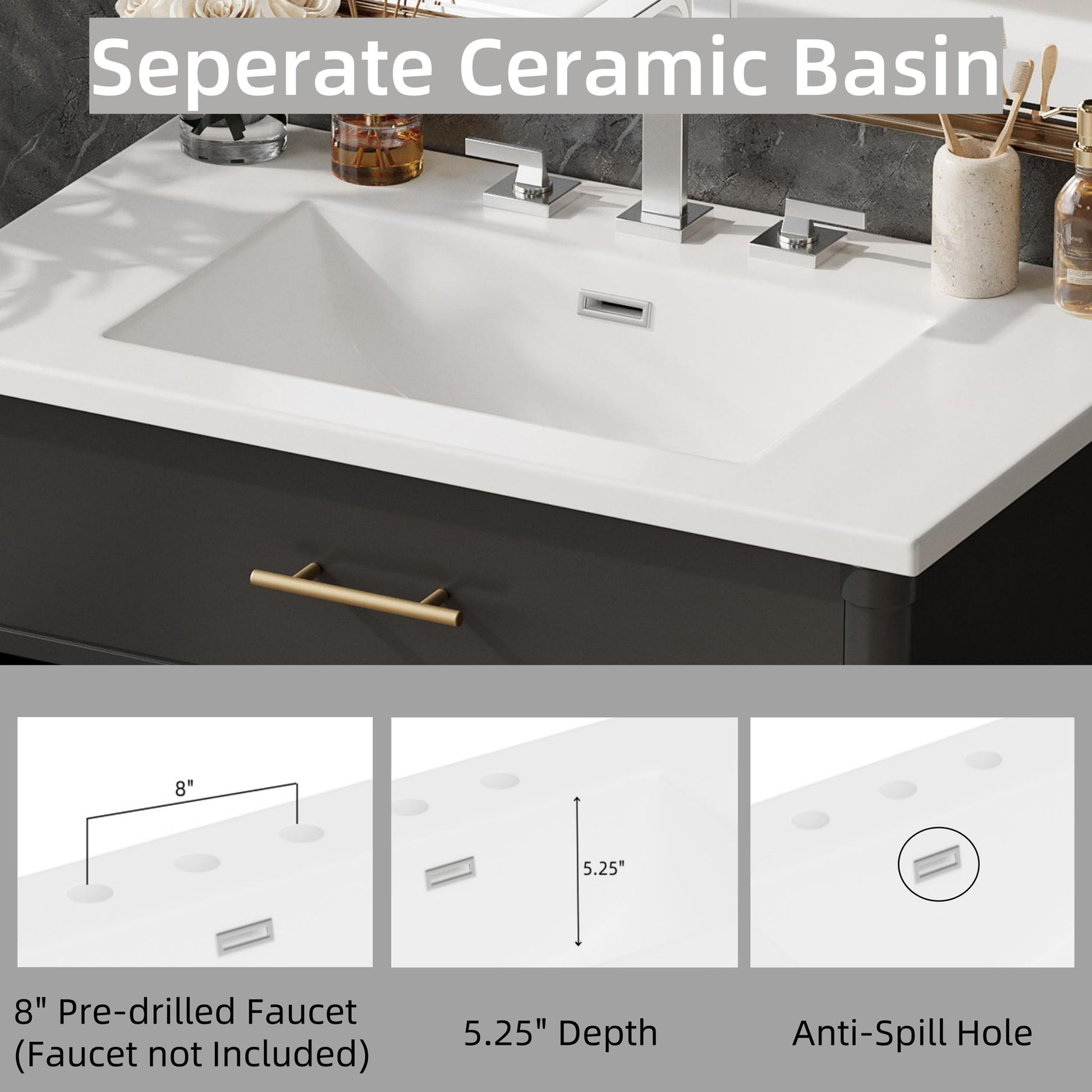 - Ceramic Sink: Smooth, glossy surface resists stains and water spots; pre-drilled faucet hole for easy installation.