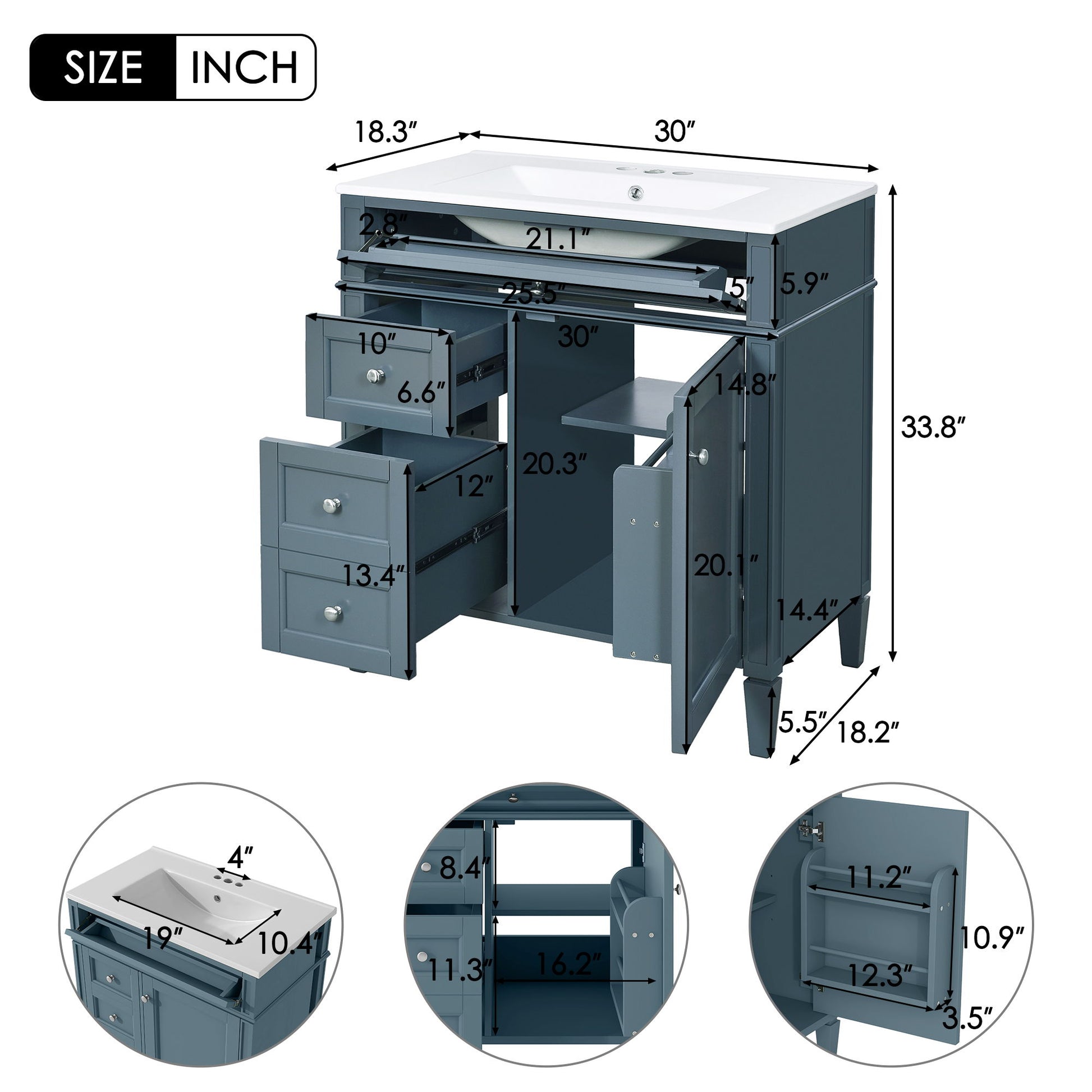 Bathroom Vanity With Top Sink, Storage Cabinet With 2 Drawers And Tip Out Drawer, Rectangular Design - Blue