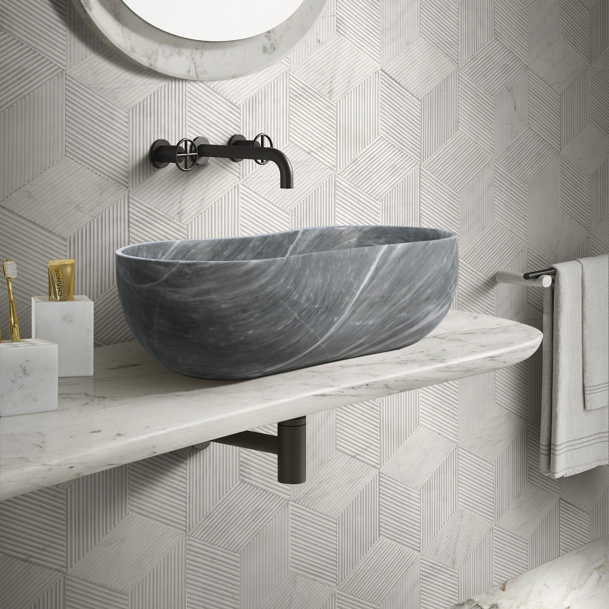 - Part of a coordinated marble collection, compatible with matching tiles and other sink shapes for unified styling.