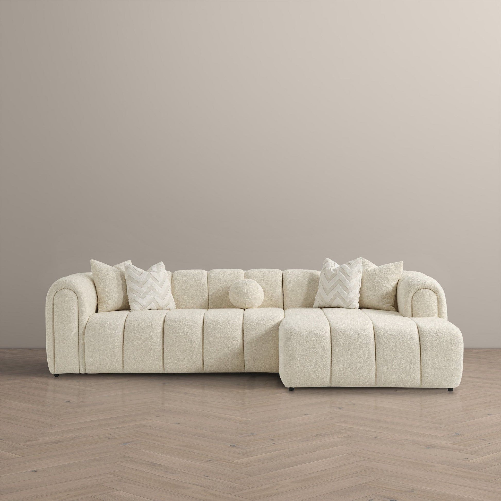 - Material and Texture: Crafted from smooth ivory boucle, the sectional provides a luxurious texture that enhances its aesthetic appeal and comfort.