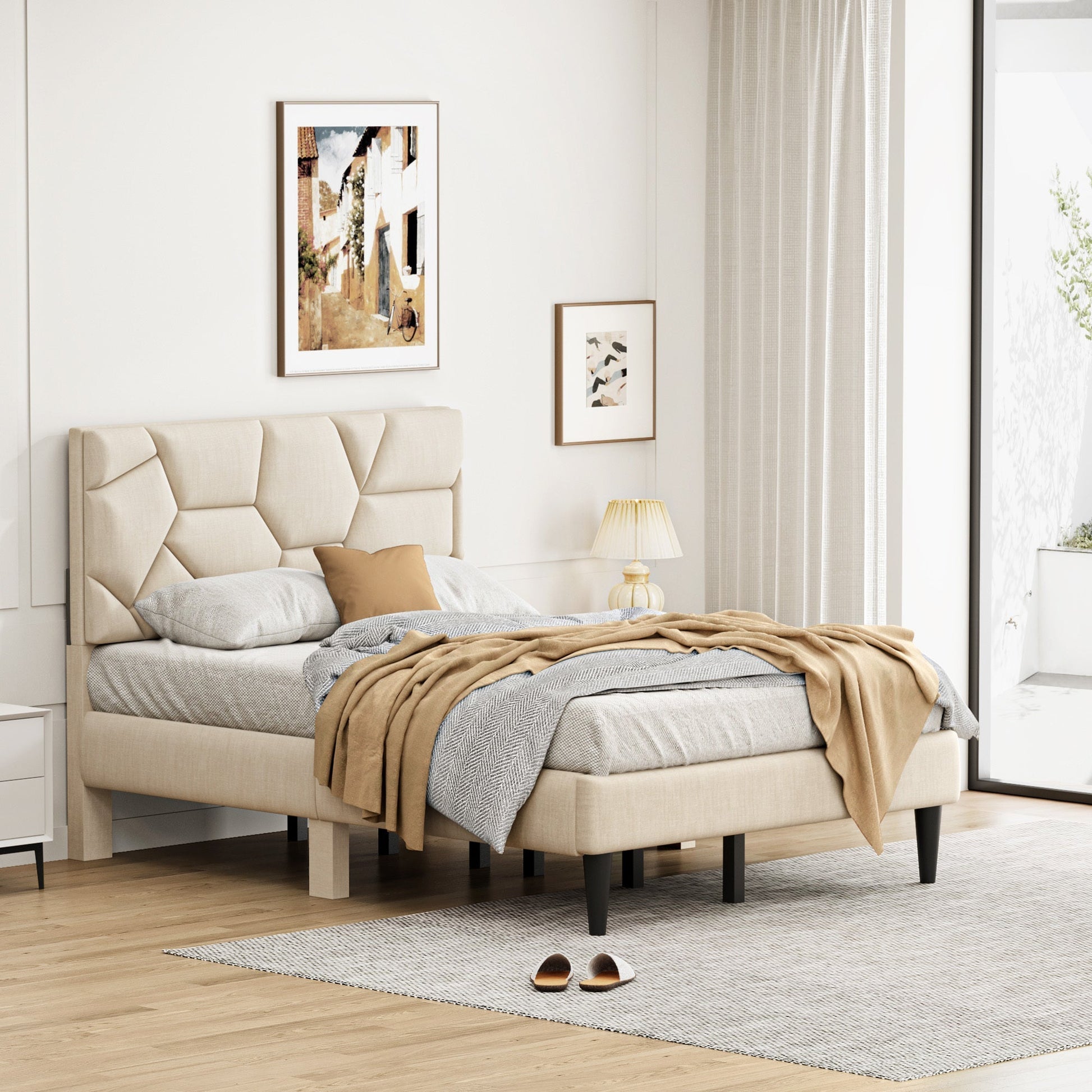 Beige Linen Full Bed Frame – Sturdy Platform Bed With Storage