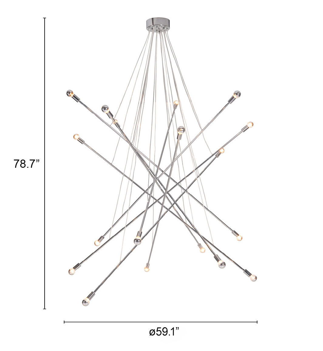 Belief ceiling lamp gives a eye caching statement to any room, with long chrome arms suspended is a elegant criss cross pattern and finished at either end with half chrome bulbs. This modern design will stun and amaze guests in residential or commercial entry ways, stairwells and any vaulted ceiling. Max Watt 25 W, Size E12, Type G45. UL approved and listed.