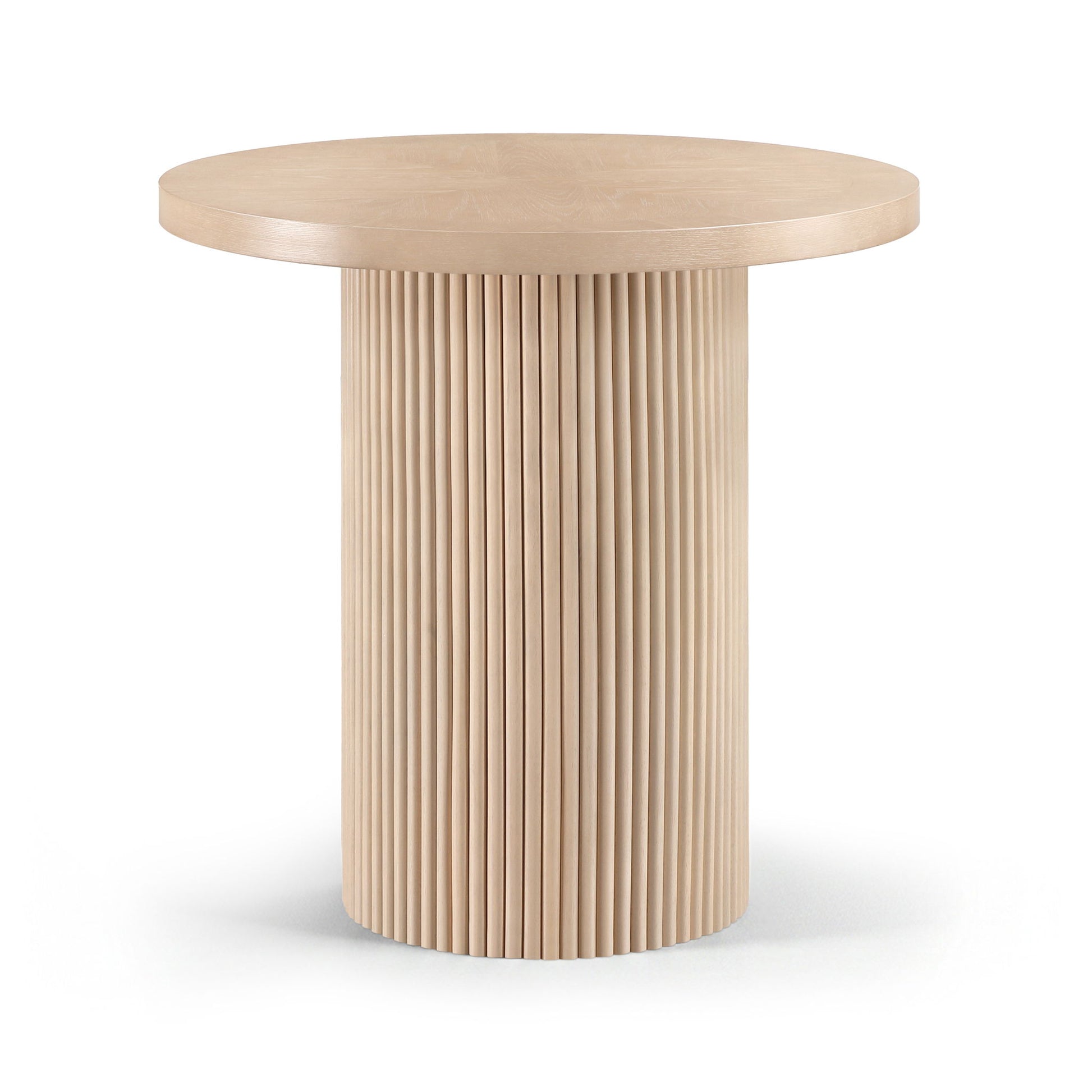 Even the smallest, most intimate dinner feels like an event when you're seated at this Belinda table. Crafted with a solid wood base and a finish oak wood veneer MDF top, its round top with fluted base exudes contemporary charm. The table top's thickness and natural wood grain variations add unique character, ensuring each piece is one-of-a-kind.
