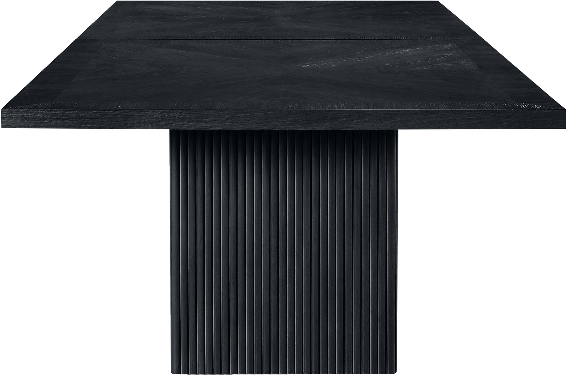 The Belinda dining table by Meridian Furniture transforms dining into a design-forward experience, where sculptural presence meets refined craftsmanship. A solid wood base anchors the silhouette, finished in black and detailed with fluted contours that lend architectural depth. Above, a square tabletop crafted from oak wood veneer over MDF introduces subtle organic character, with natural grain variations ensuring no two tables are exactly alike.