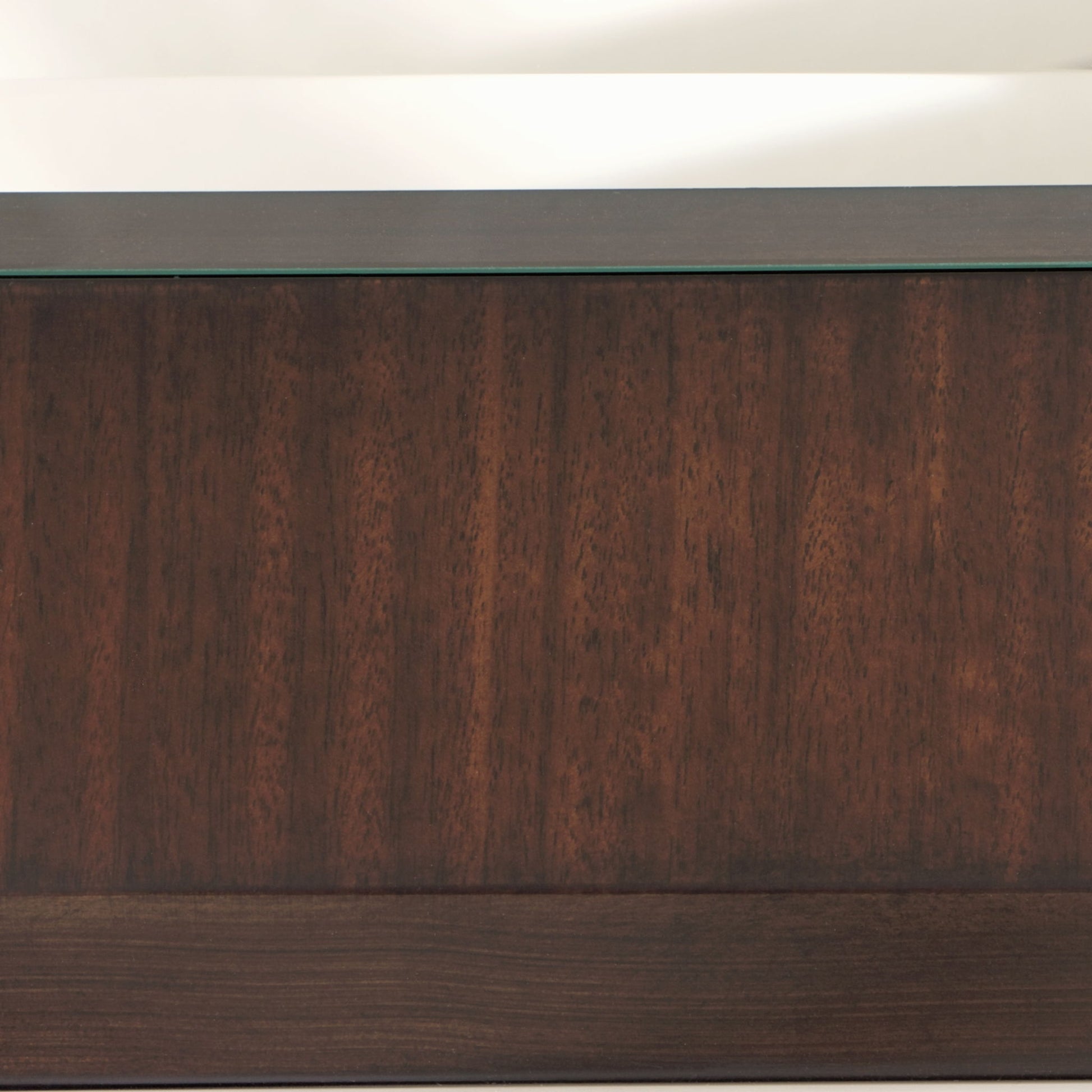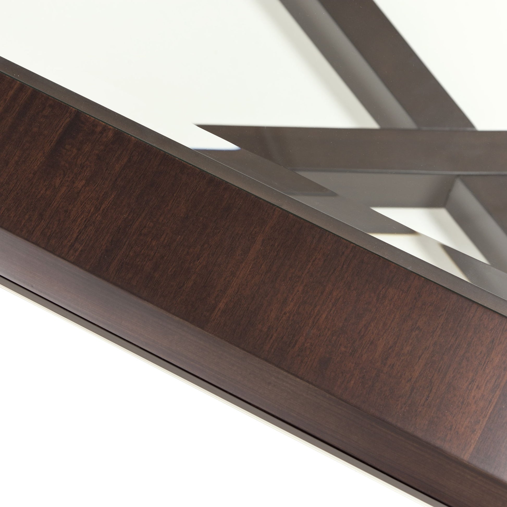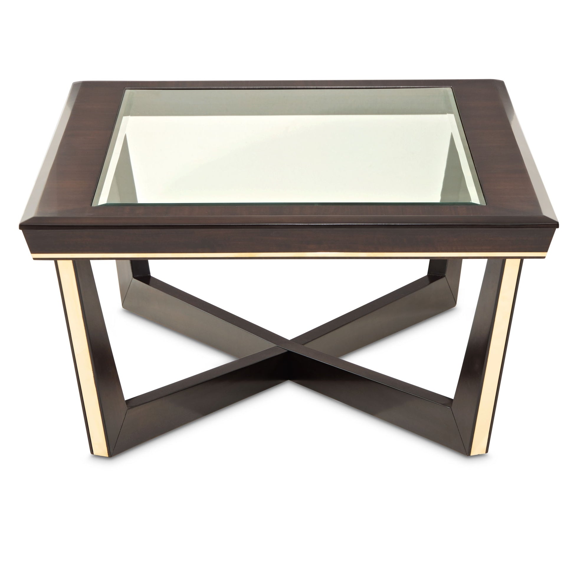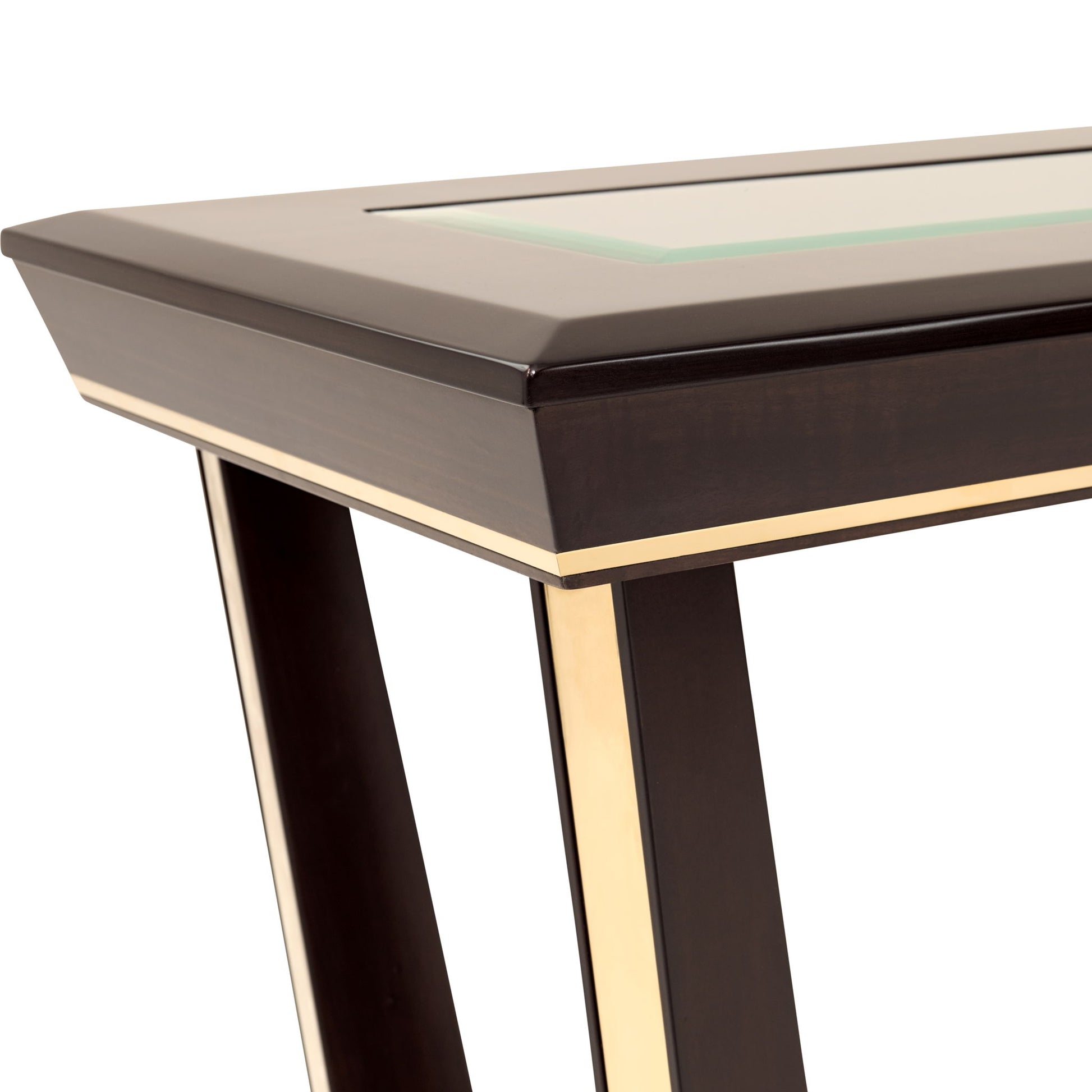 Bold and architectural, the Belmont Place Table is a masterclass in modern glamour. Wrapped in a deep espresso eucalyptus veneer, its expansive frame is edged in luminous Japan Gold alloy, drawing the eye to its dynamic, angular base. The beveled glass top introduces a note of airy sophistication, allowing the artistry of the base to shine from every angle.