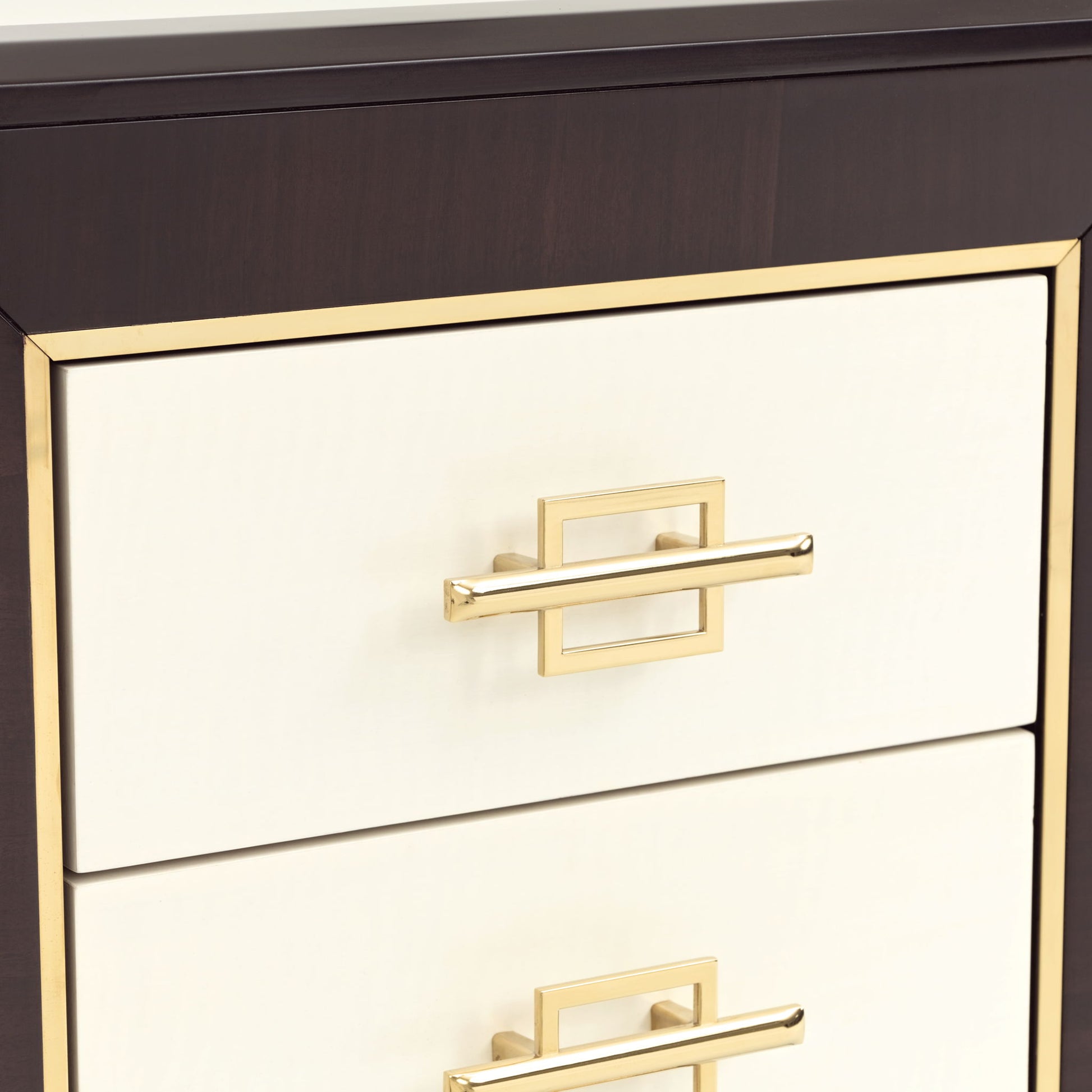 Exuding refined glamour, the Belmont Place Vanity Desk pairs bold contrast with sophisticated craftsmanship. Its rich espresso eucalyptus veneer creates a deep, lustrous frame, while the white anigre drawer fronts and inlaid panels offer a striking visual balance. A sleek glass center top adds a contemporary polish, perfectly complementing the warm glow of the Japan Gold alloy base and hardware. With seven velvet-lined drawers, this versatile silhouette transitions effortlessly from an elegant vanity to a chic writing desk, making it as functional as it is beautiful.