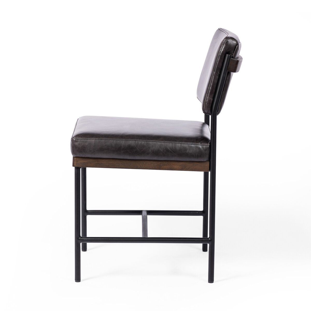 Bring a luxe, modern presence to the dining space with the Benton Dining Chair from Four Hands. An airy silhouette is created by slim iron framing finished in black, setting a refined foundation for richly toned black upholstery. Solid oak decking adds warmth and contrast, resulting in a layered material mix that feels both elevated and architectural.