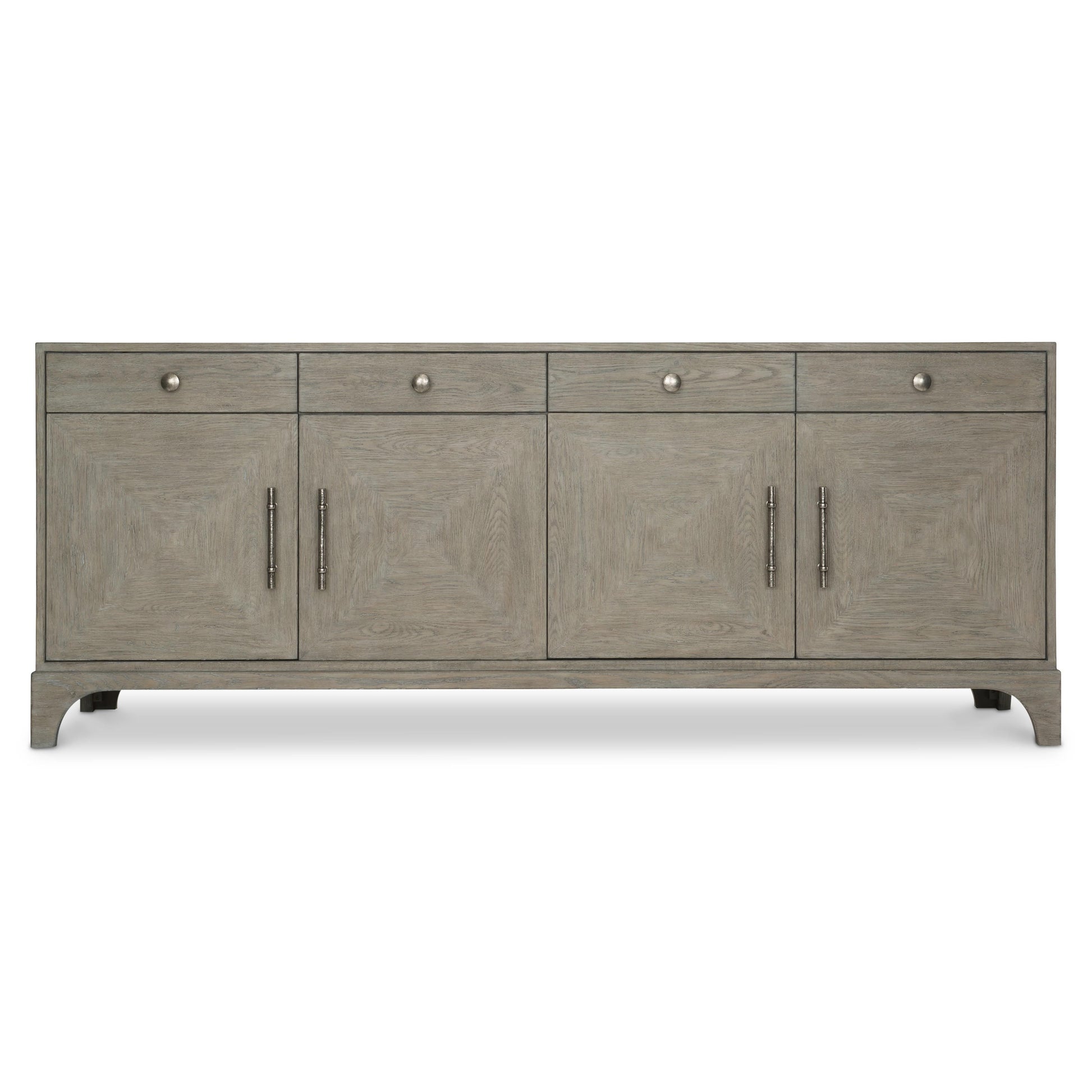 Designed to support today’s entertainment needs, the credenza pairs visual sophistication with discreet performance details. Four top drawers offer convenient storage for remotes and media accessories, while the lower fancy face doors open to reveal adjustable shelving with integrated ventilation and cord management. Textural cast zinc hardware, featuring understated drawer pulls and striking bar handles on the doors, completes the look with a subtle layer of contrast and craftsmanship.