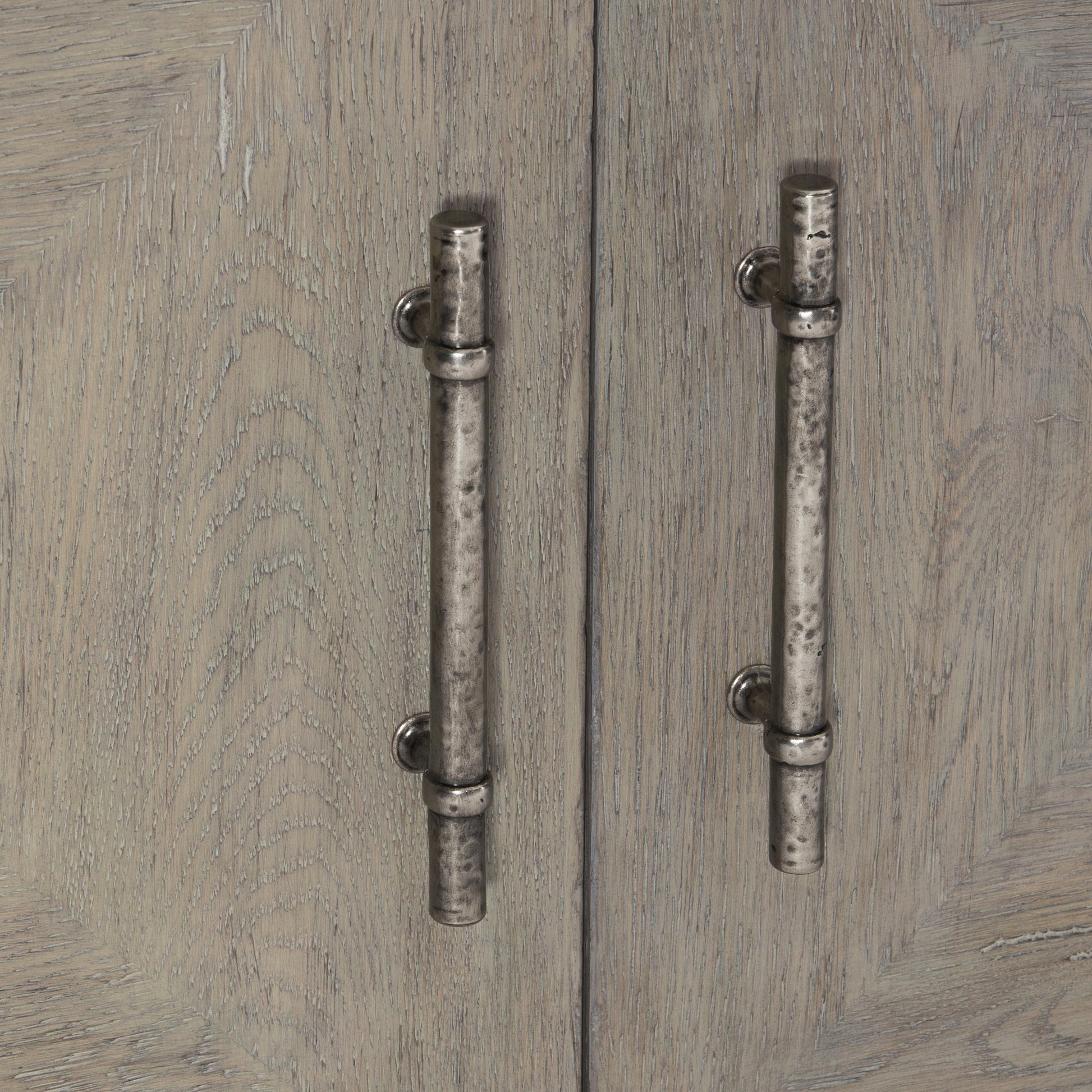 - Textural cast zinc hardware with drawer pulls and bar-style door handles