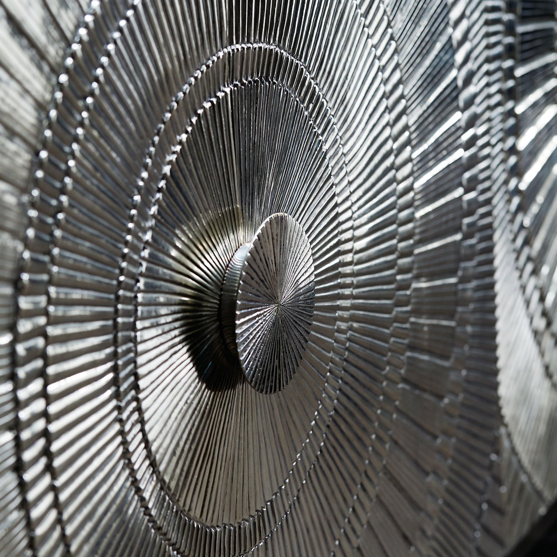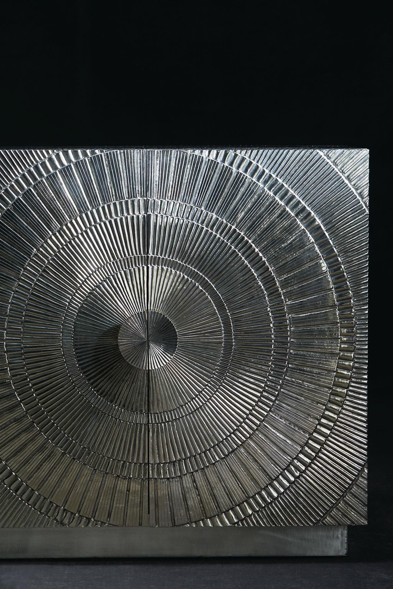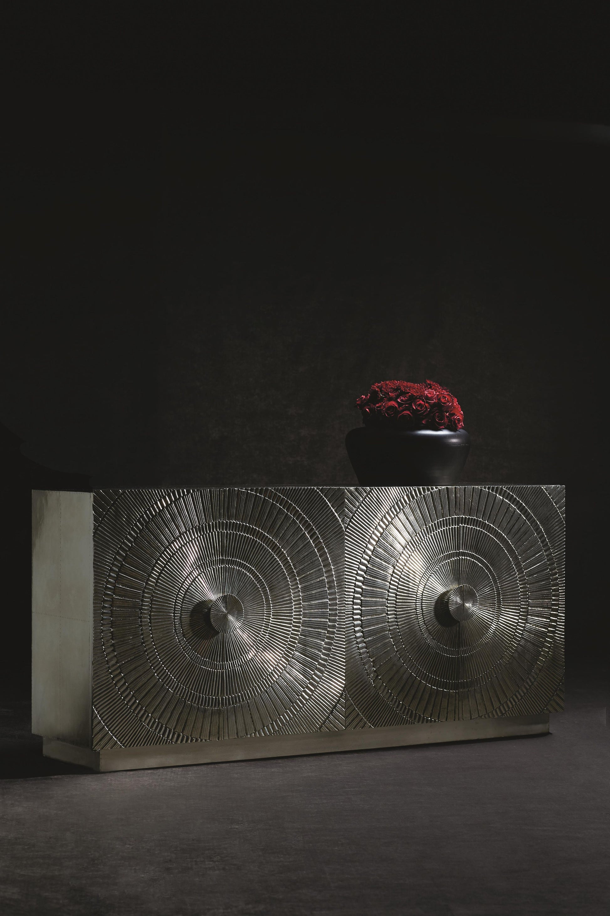 The Barcelona Entertainment Credenza presents a striking balance of modern glamour and artisanal character. Wrapped entirely in German silver, including the back, the case radiates a luminous sheen that elevates the credenza’s sculptural presence. Beneath the metal exterior, reclaimed teak wood brings warmth and authenticity, while embossed circular detailing across the doors introduces depth, texture, and a refined sense of artistry.