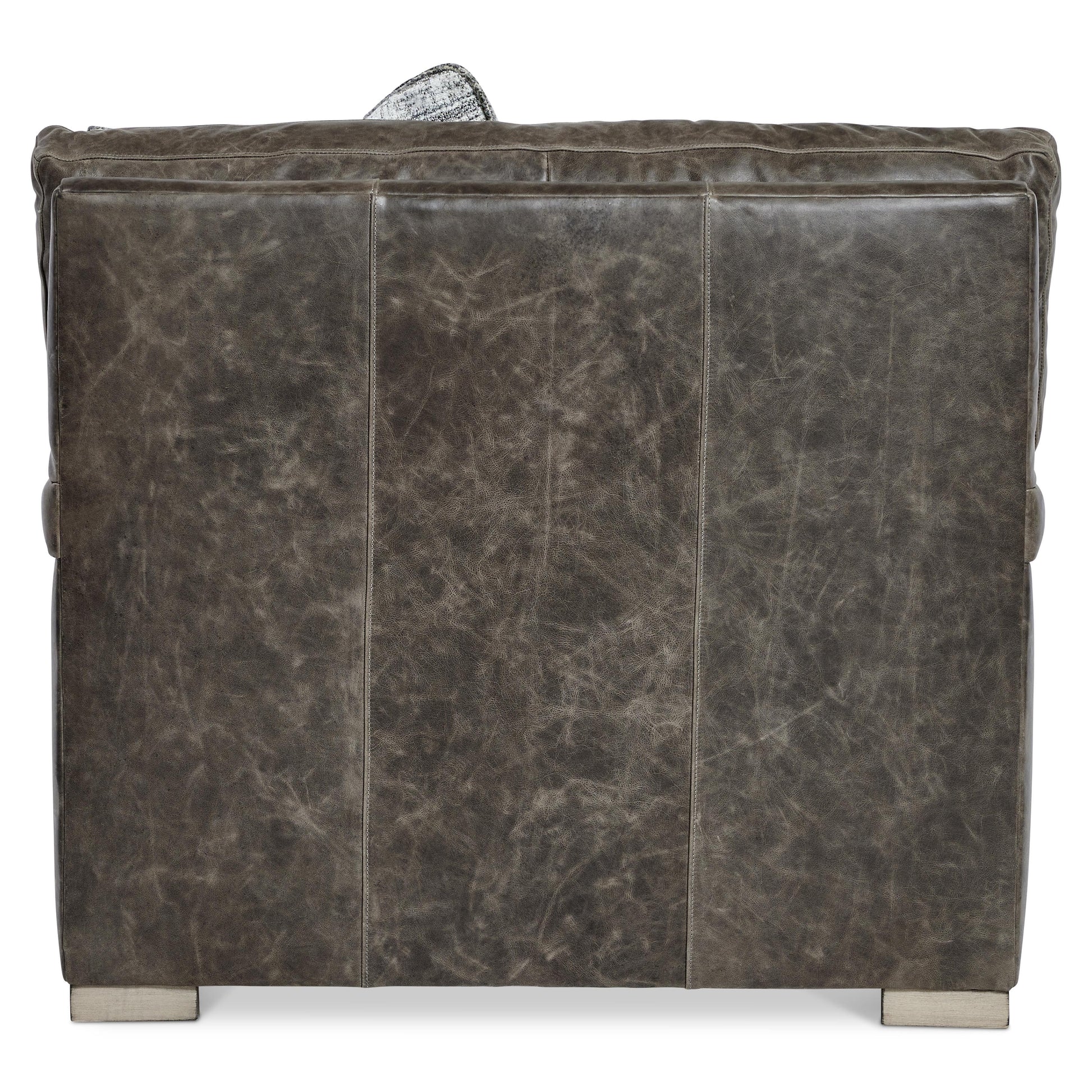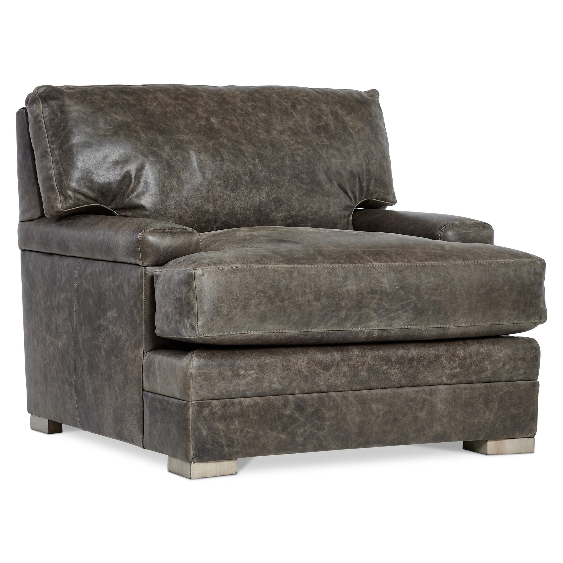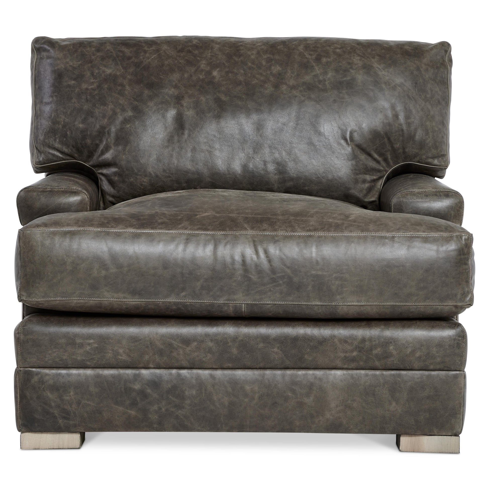 Designed for relaxed lounging, the chair features a deep seat cushion paired with a box-stitched back pillow for structured support. A complementary throw pillow enhances both comfort and style, while wood elements finished in Portobello lend warmth and grounding contrast. The result is a leather chair that feels both inviting and considered, ideal for sophisticated living spaces.