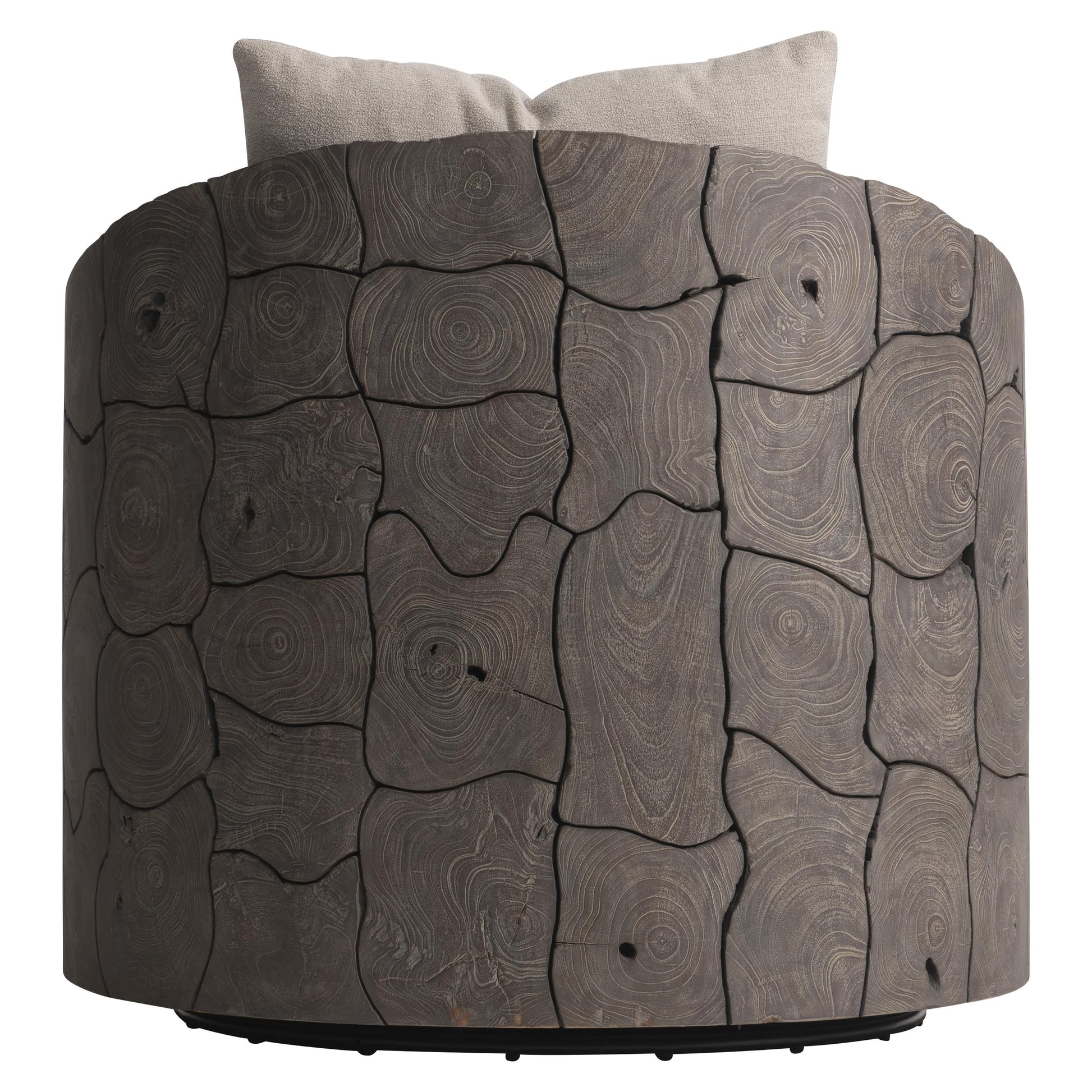The Calypso Outdoor Swivel Chair reinterprets the classic barrel silhouette through a distinctly modern lens. An open-work design of sliced teak forms a sculptural frame, bringing organic texture and visual lightness to outdoor seating. The curved back wraps gracefully around the chair, creating an inviting presence that feels both architectural and relaxed.