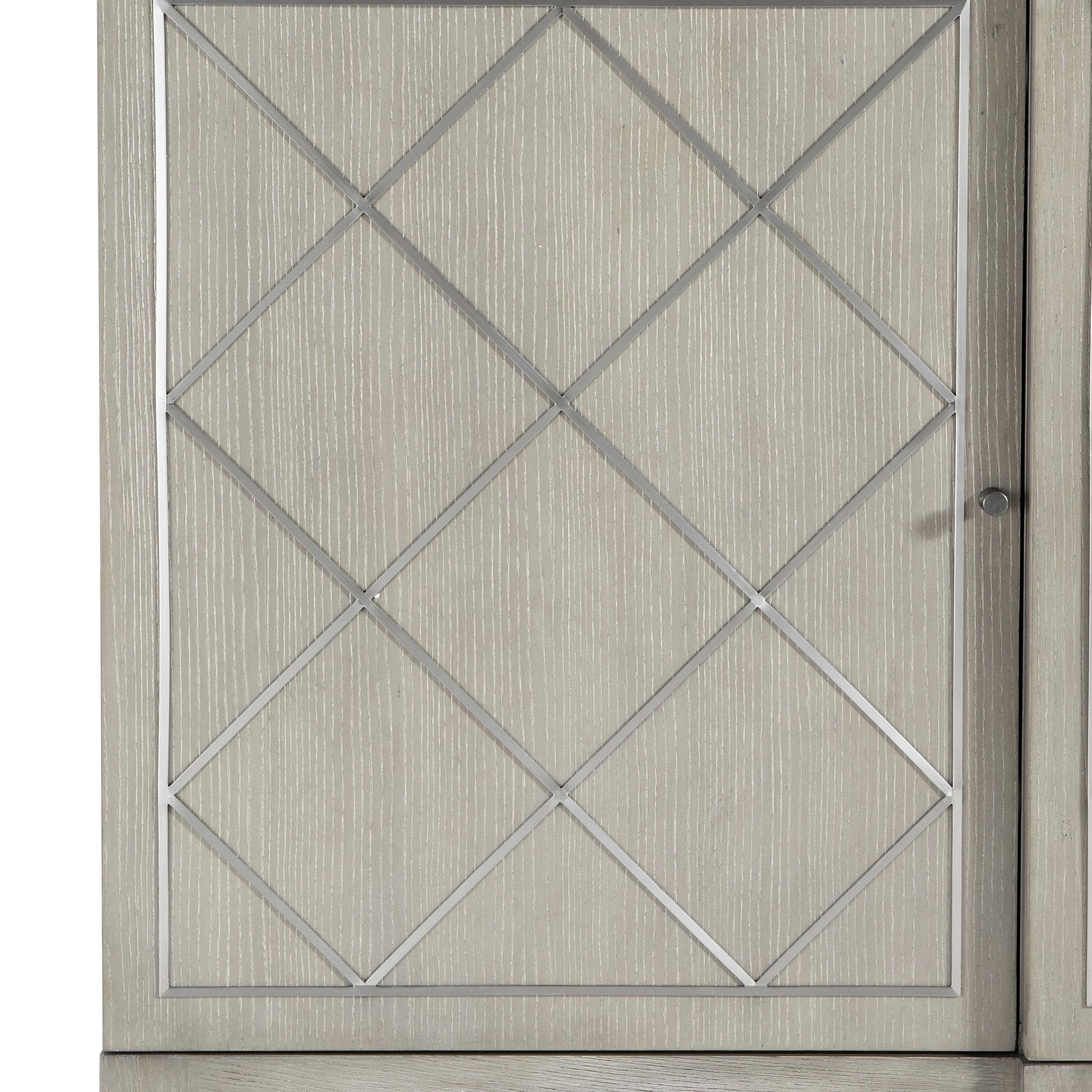 The Cornelia Entertainment Credenza presents a refined balance of classic pattern and contemporary restraint. A brushed stainless steel diamond overlay spans the door fronts, introducing a subtle shimmer that elevates the clean geometry of the ash wood case. Finished in Nebbia, the warm wood tone creates a sophisticated backdrop for the metal detailing, resulting in a composed yet visually engaging presence.