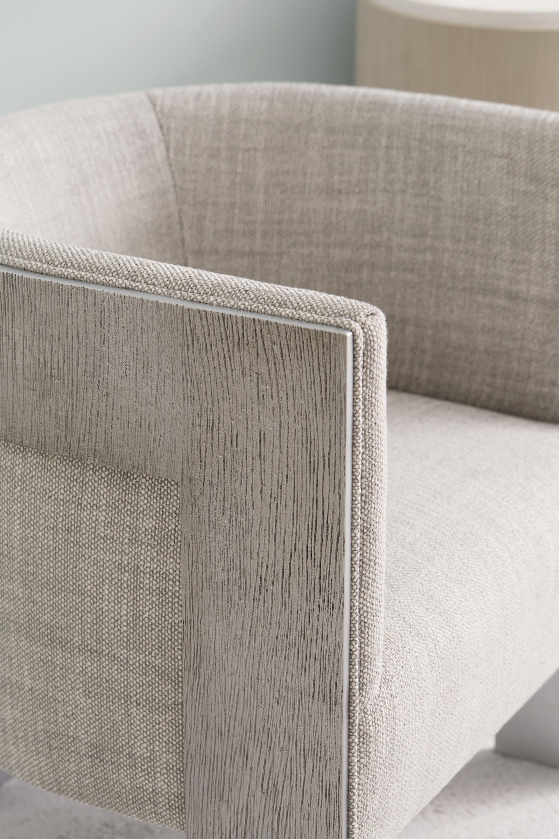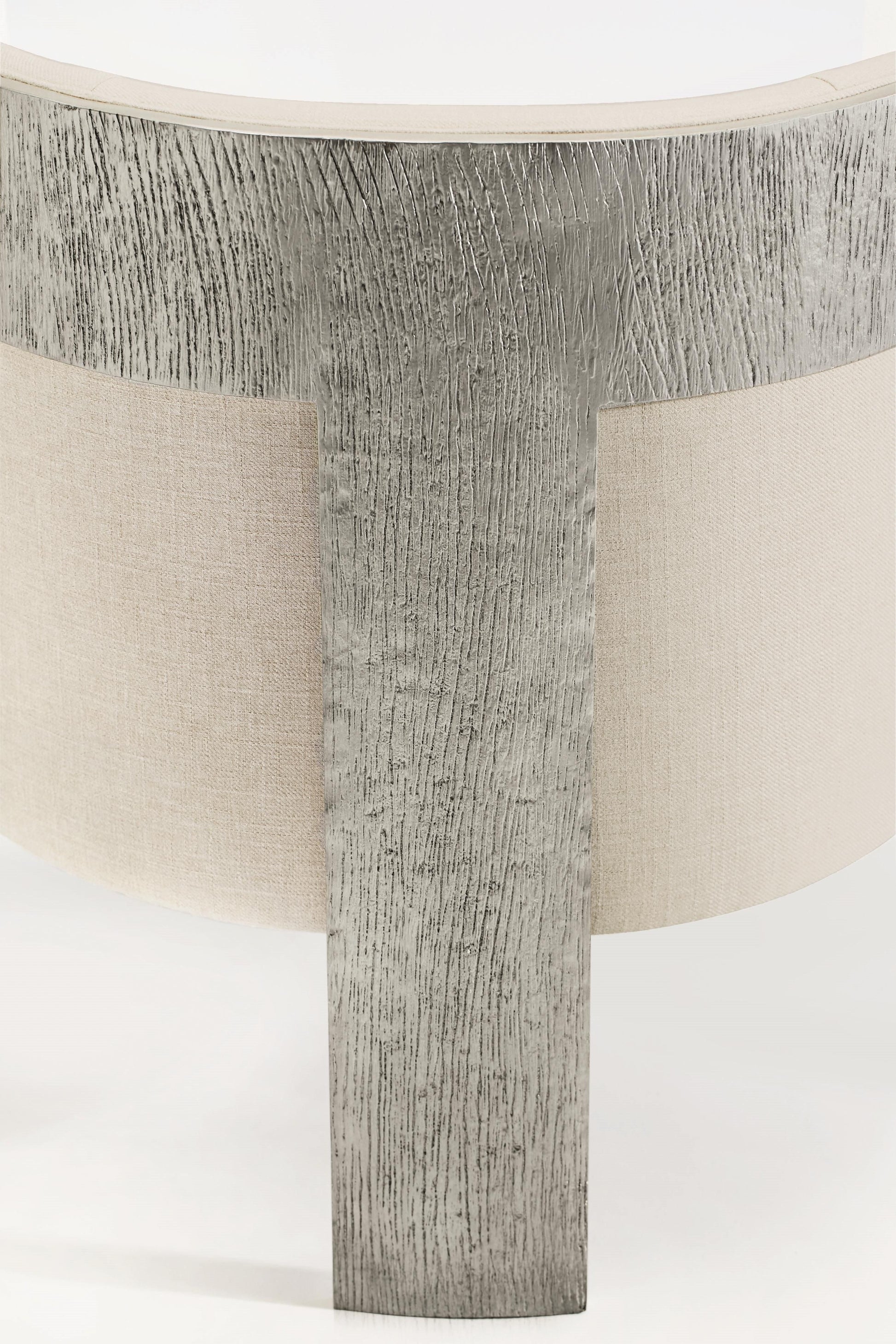 The Cosway Fabric Chair reimagines the classic barrel silhouette through a modern, sculptural lens. A gracefully curved frame wraps around the upholstered body, creating a striking sense of enclosure while softening the visual lines of the room. Finished in antique silver with a subtle wood grain texture, the exterior delivers a refined balance of organic character and contemporary glamour.