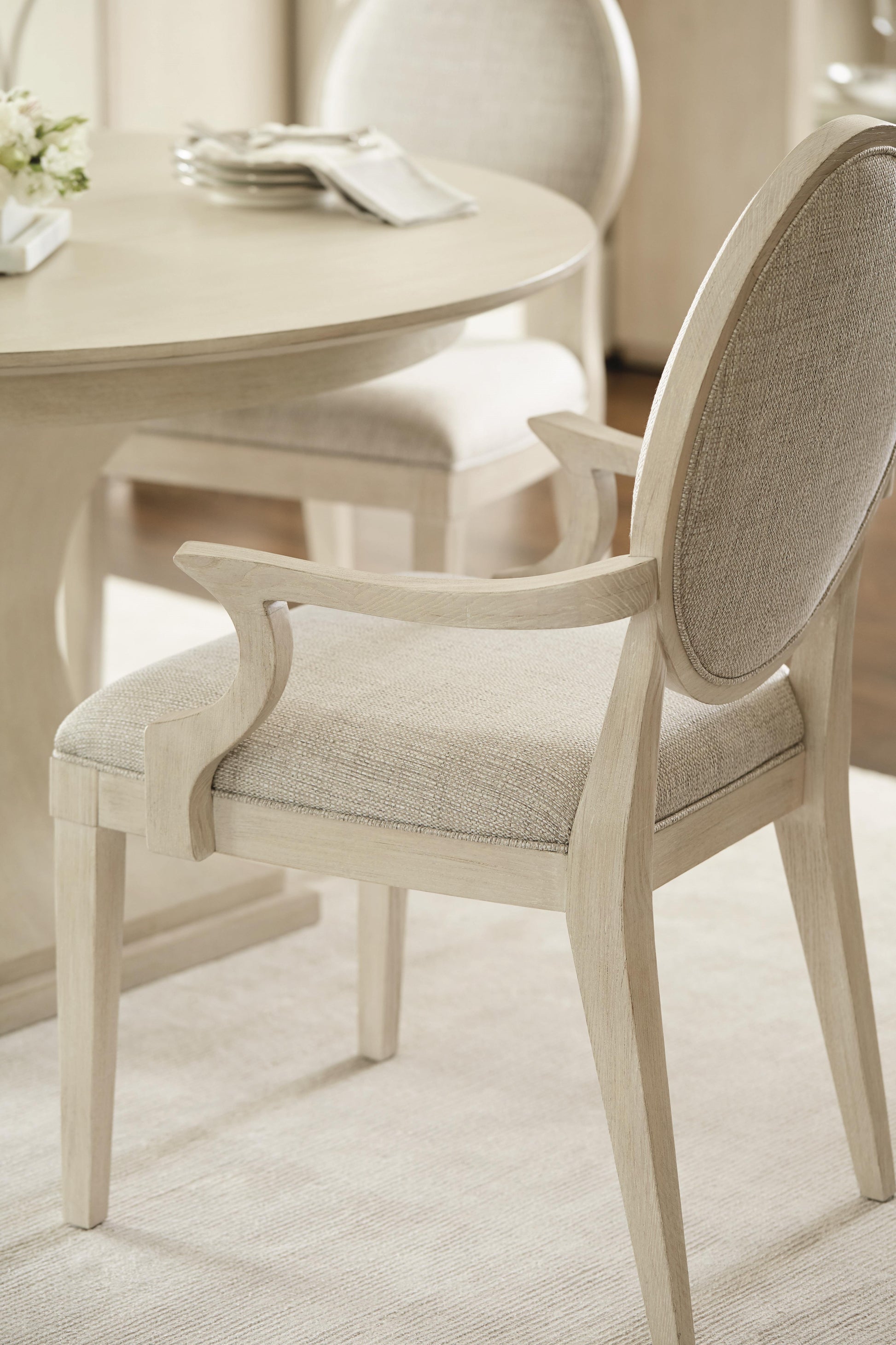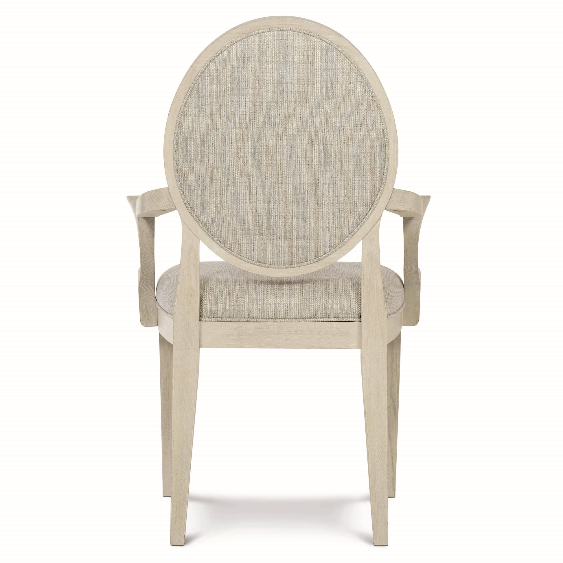 The East Hampton Arm Chair reflects a refined balance of clean architecture and graceful form. Designed with a fluid silhouette, it features an upholstered oval back, sculpted arms, and gently tapered legs that lend an understated elegance to dining or accent settings. The exposed ash wood frame is finished in a soft Cerused Linen tone, creating a light, airy presence grounded in thoughtful craftsmanship.