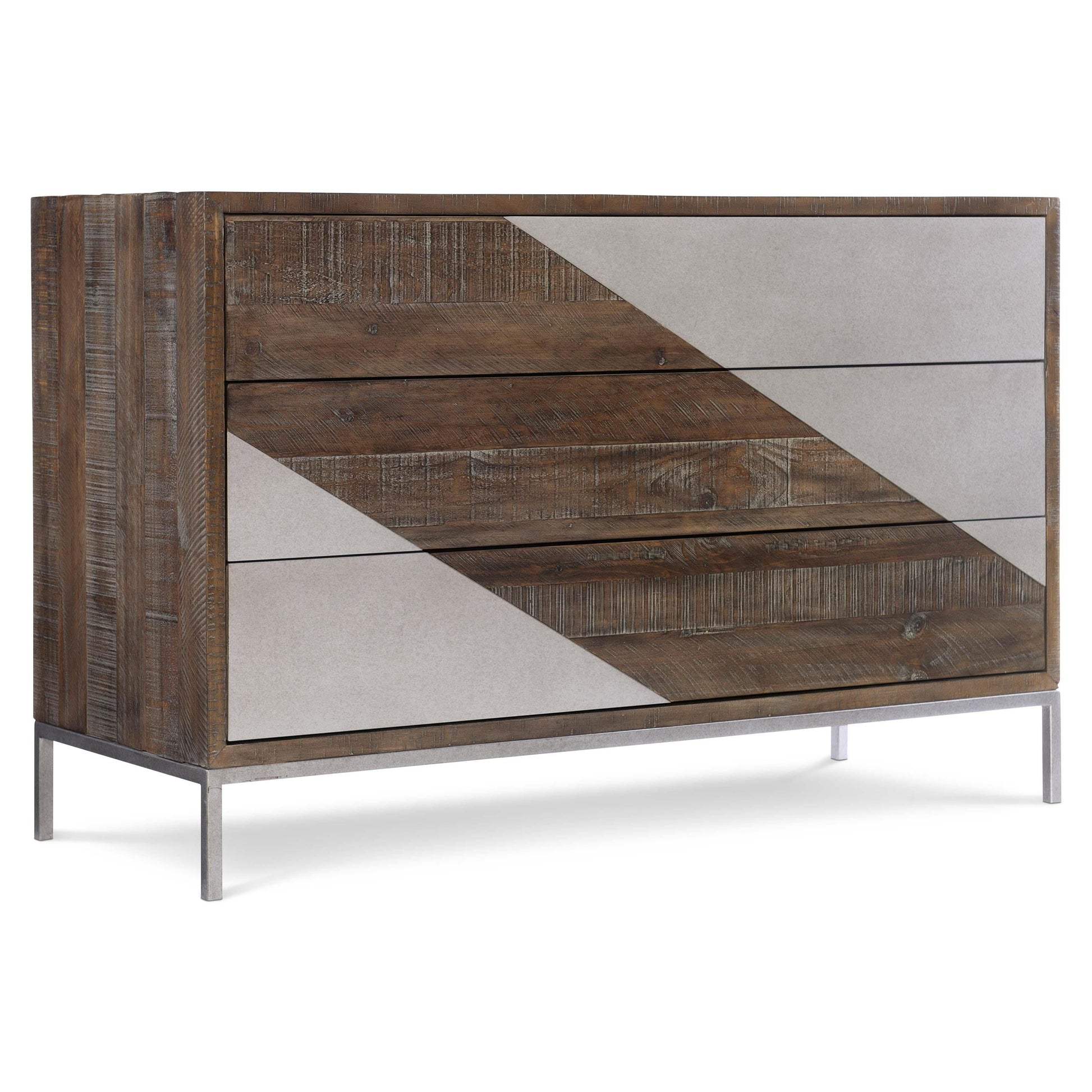The Eastman Drawer Chest embodies modern minimalism through a confident mix of materials and clean architectural lines. Distressed pine brings warmth and texture, finished in a deep Sable Brown that grounds the design, while steel accents introduce a refined industrial edge. Recessed metal overlays create an asymmetrical composition across the drawer fronts, giving the piece a sculptural presence that feels both intentional and contemporary.