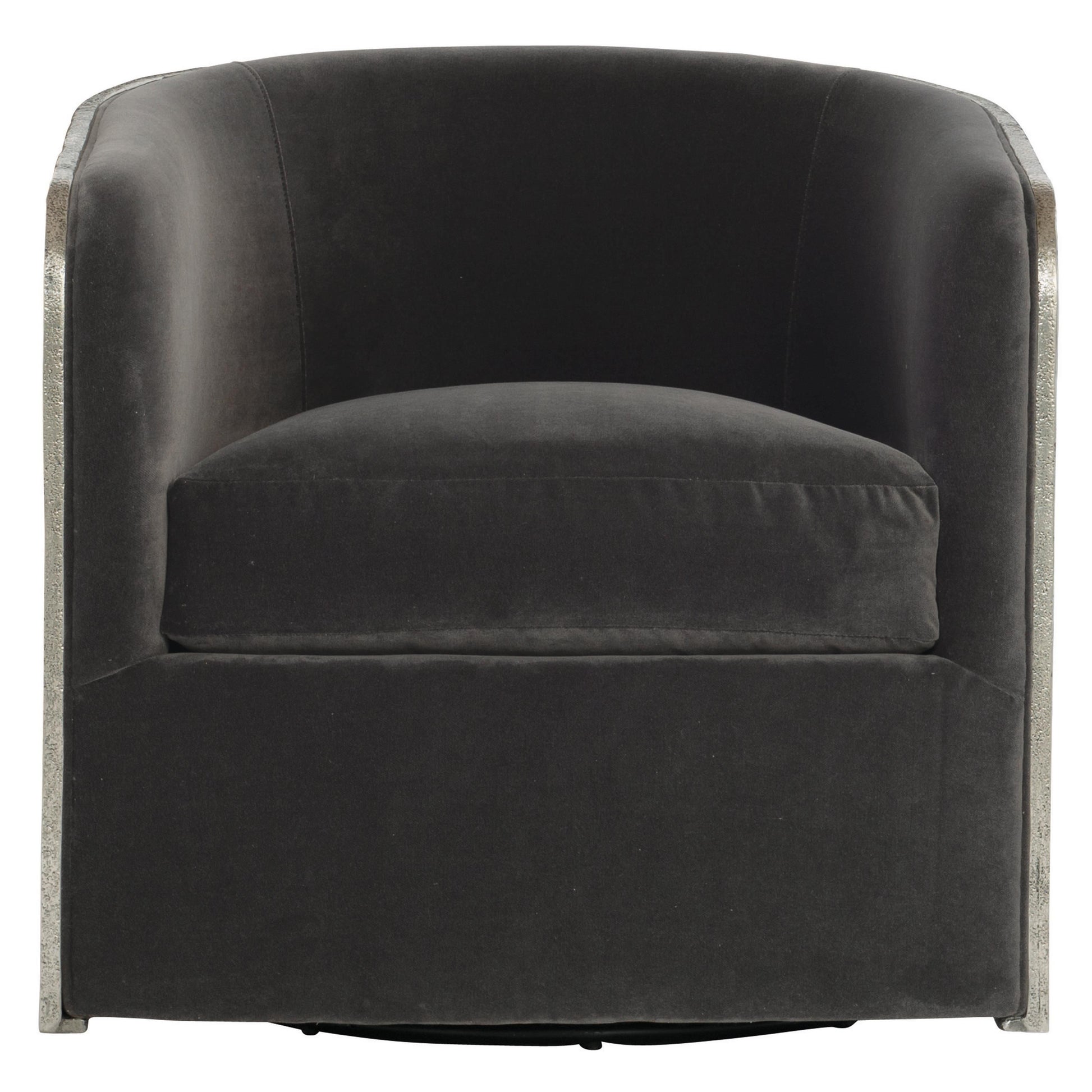 Balancing the strength of its metal frame, the chair features an exceptionally soft seat and an upholstered front panel that invite comfort without compromising design. A smooth base allows for a full 360-degree swivel, making the Eliot chair as functional as it is expressive—ideal for living spaces where movement, conversation, and visual impact are equally important.
