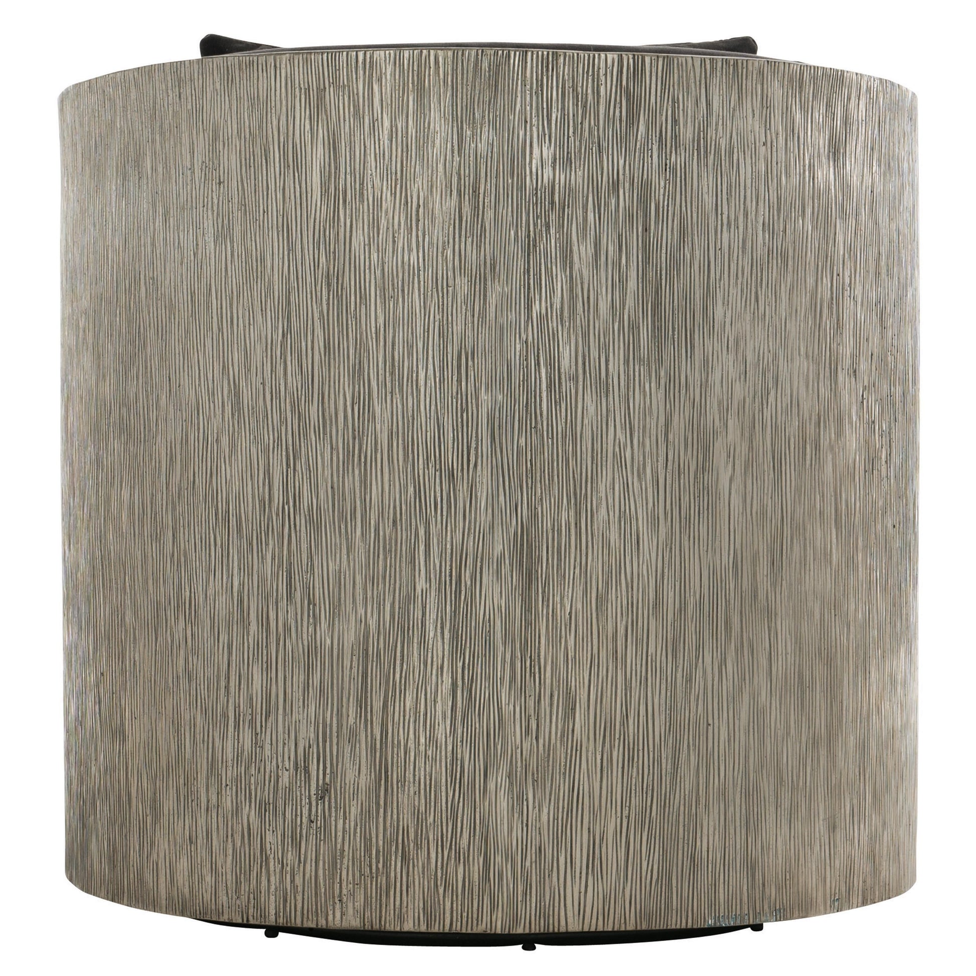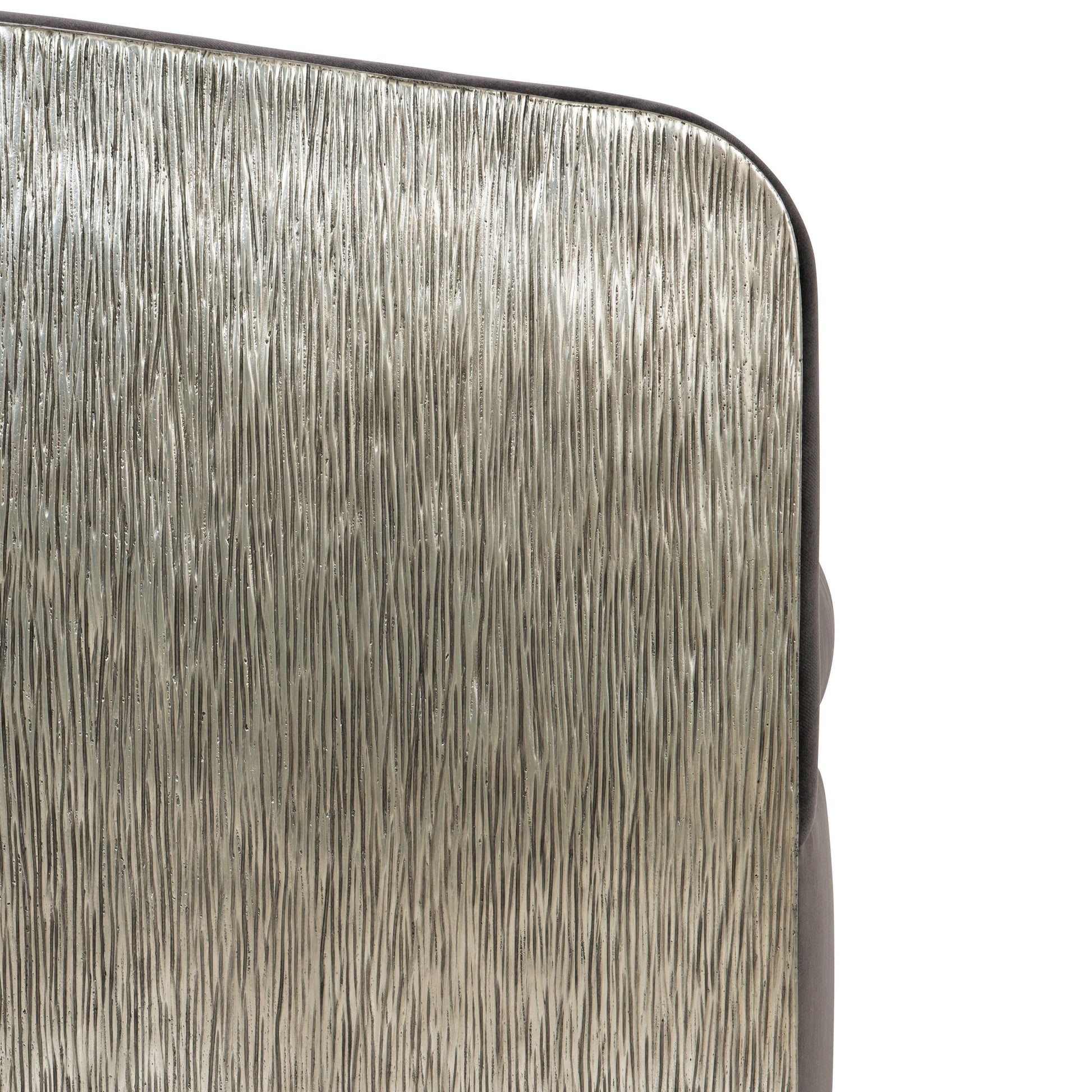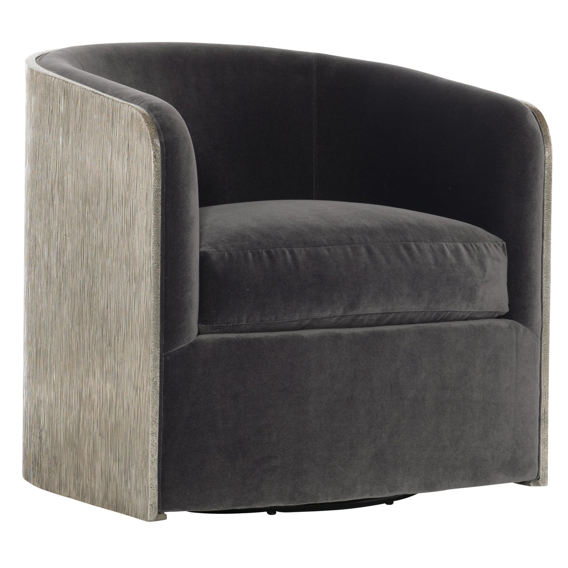 The Eliot Fabric Swivel Chair presents a sculptural presence defined by an organic pattern etched into a burnished cast aluminum frame. The interplay of metal texture and refined form creates a visually striking silhouette, bringing artful depth and modern character to any interior setting.