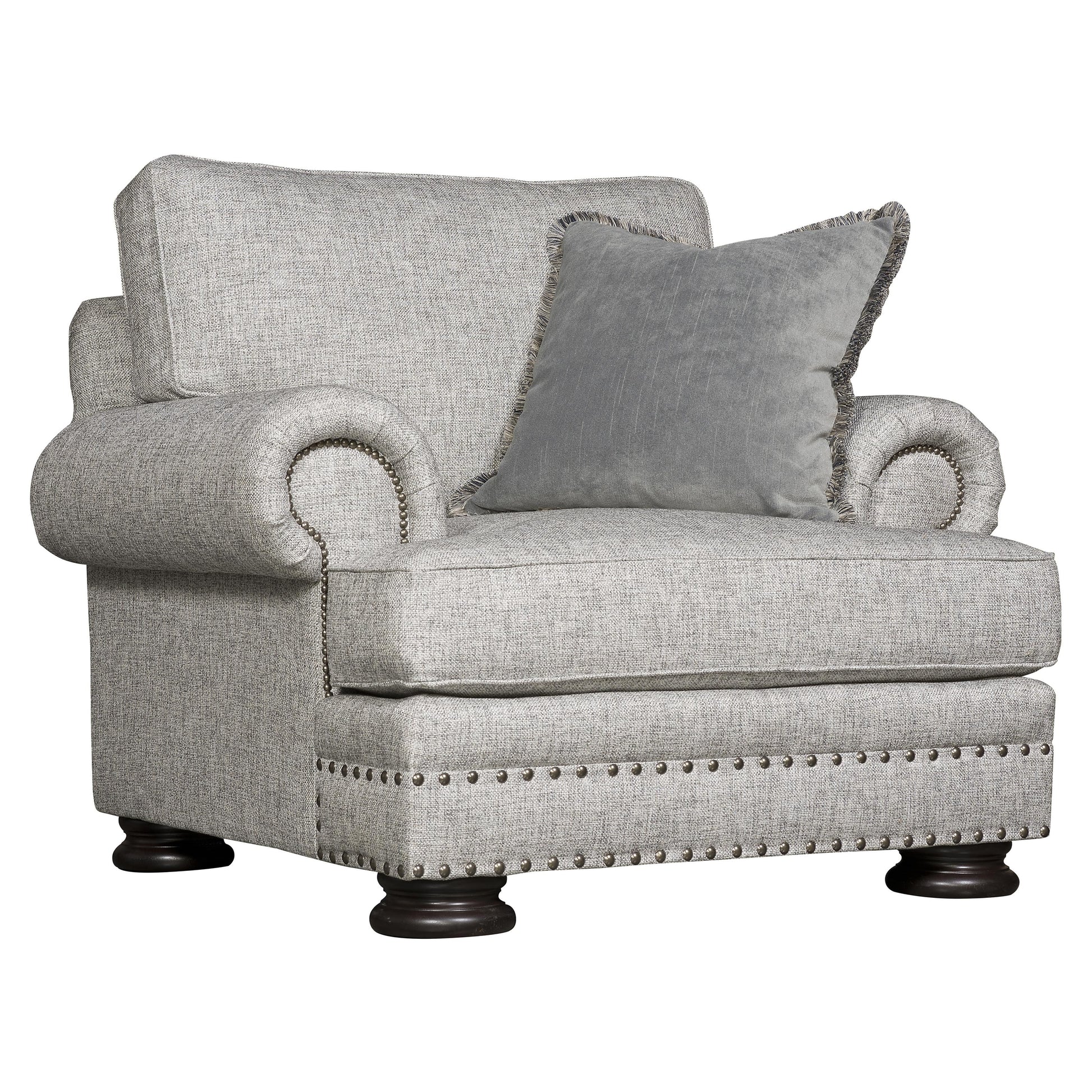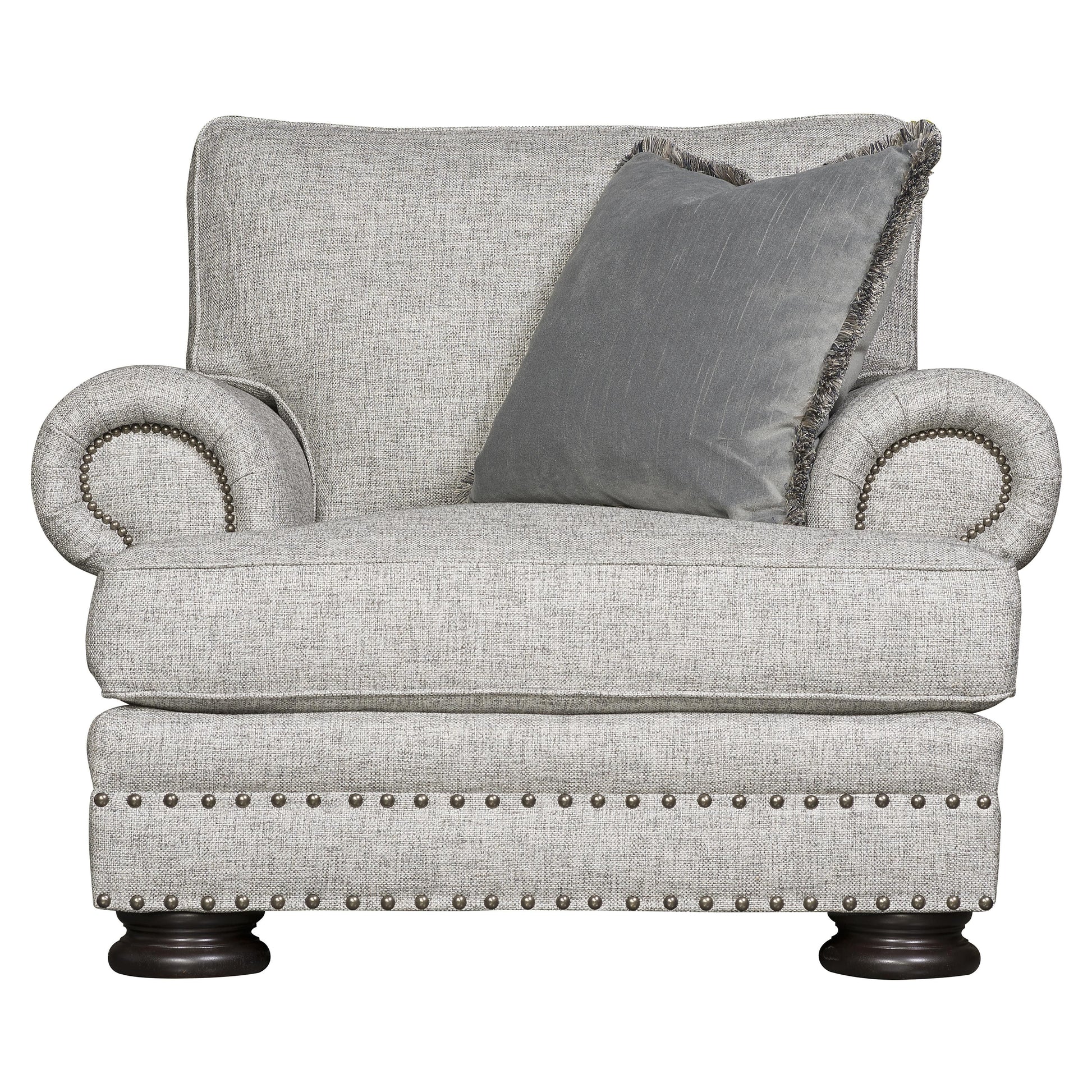 Exposed wood legs in a rich mocha finish ground the design with warmth, complemented by antique nickel nailhead trim along the arms and base for a subtle decorative accent. A coordinating throw pillow adds an extra layer of comfort and visual interest, making the Foster chair a luxurious statement on its own or an ideal companion to the Foster Ottoman.