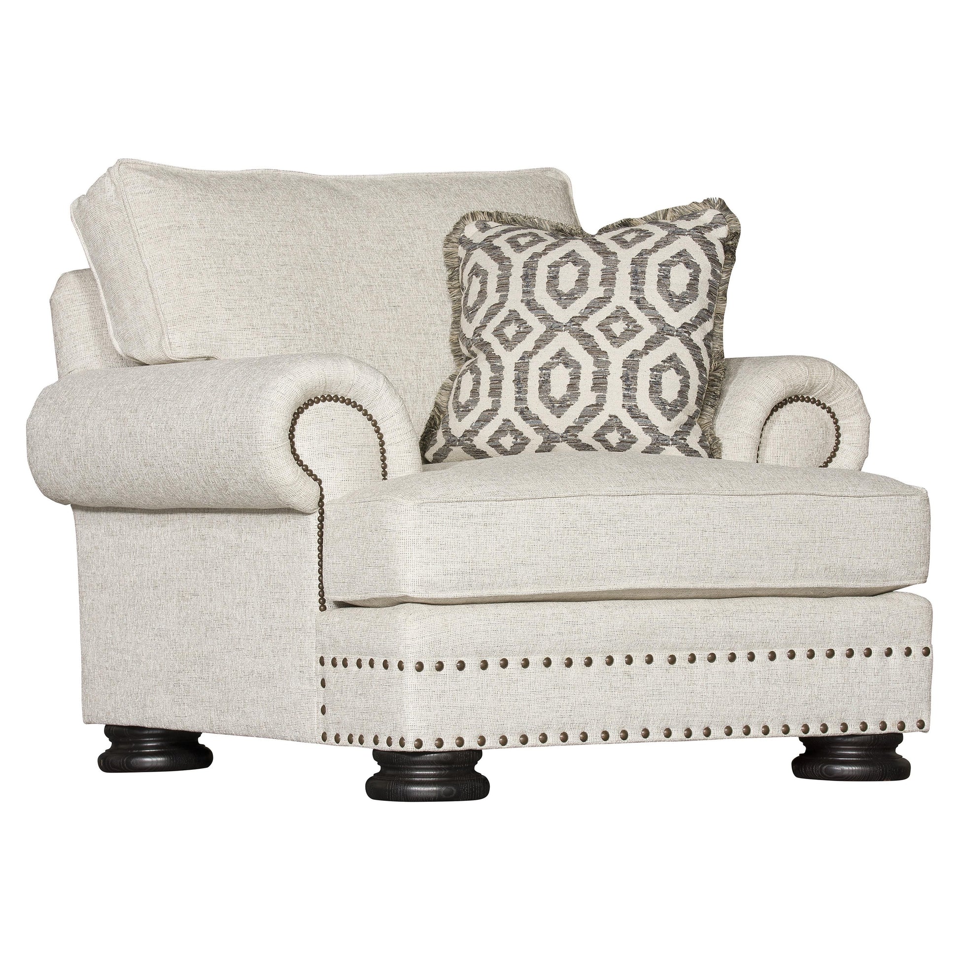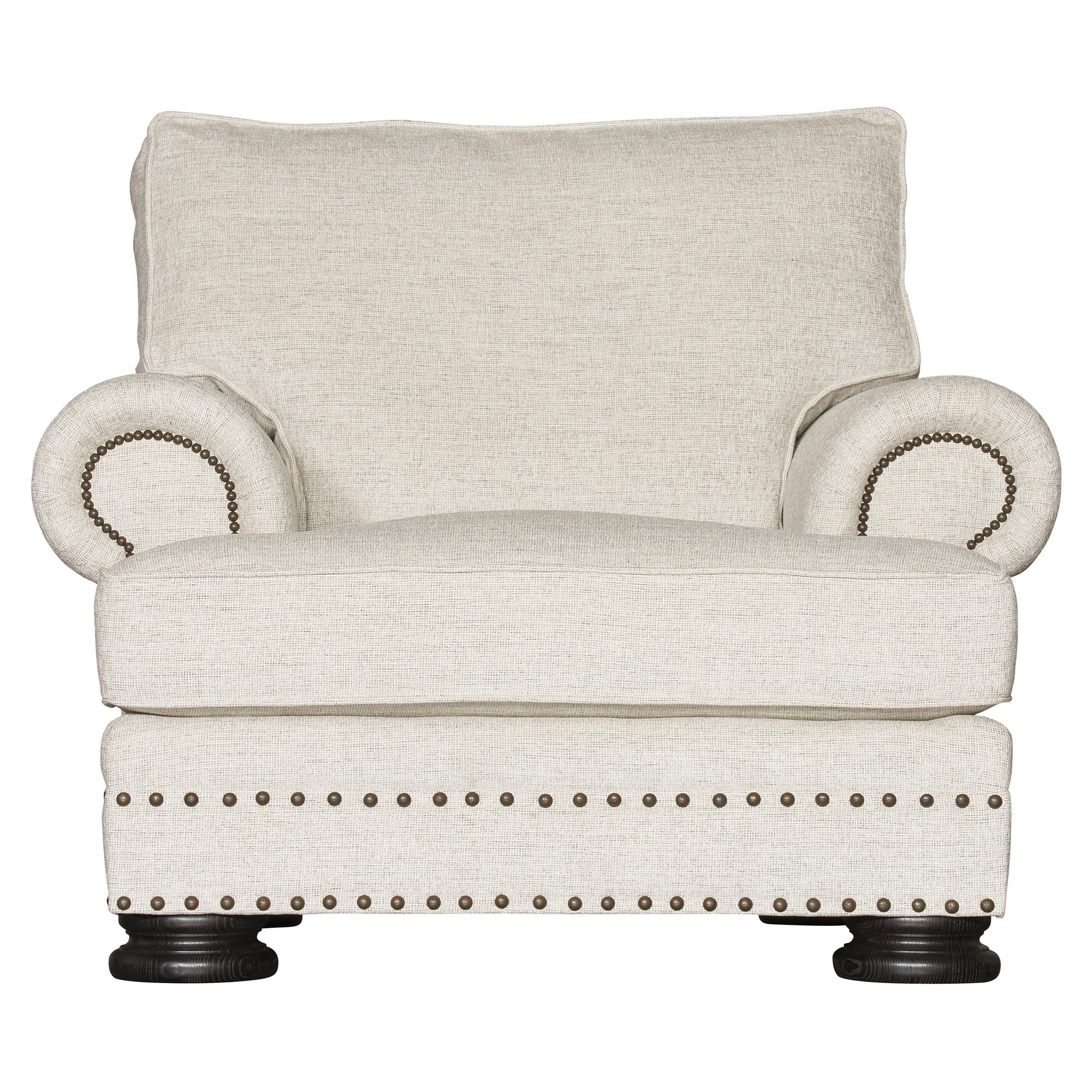 Traditional accents define the Foster Fabric Chair, a generously scaled design that brings classic luxury into a relaxed seating form. Rolled arms, nailhead trim, and exposed wood legs work together to create a timeless silhouette, while the padded frame and substantial seat and back cushions lend a welcoming sense of comfort and visual depth.