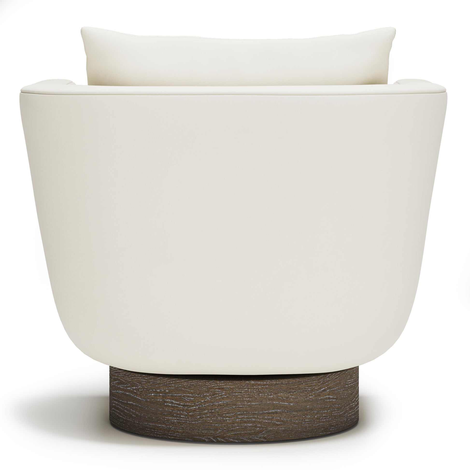 The Gemma leather swivel chair introduces sculptural presence to a modern interior with its distinctive u-shaped frame. The silhouette rises and curves gracefully from the seat, creating a sense of lift and visual movement that feels both architectural and inviting. Upholstered in rich leather and grounded by a wood base in Portobello finish, the design balances warmth with contemporary refinement.