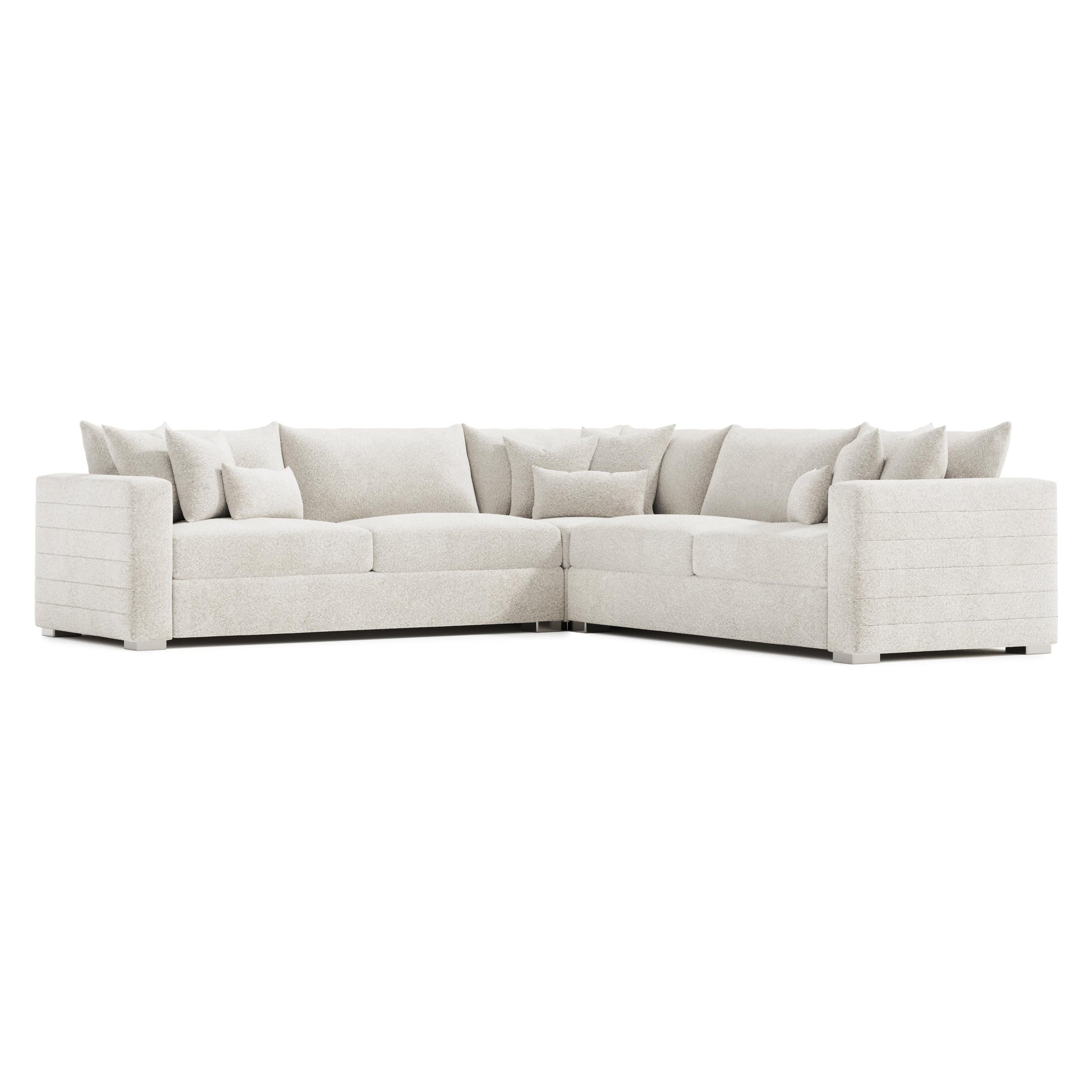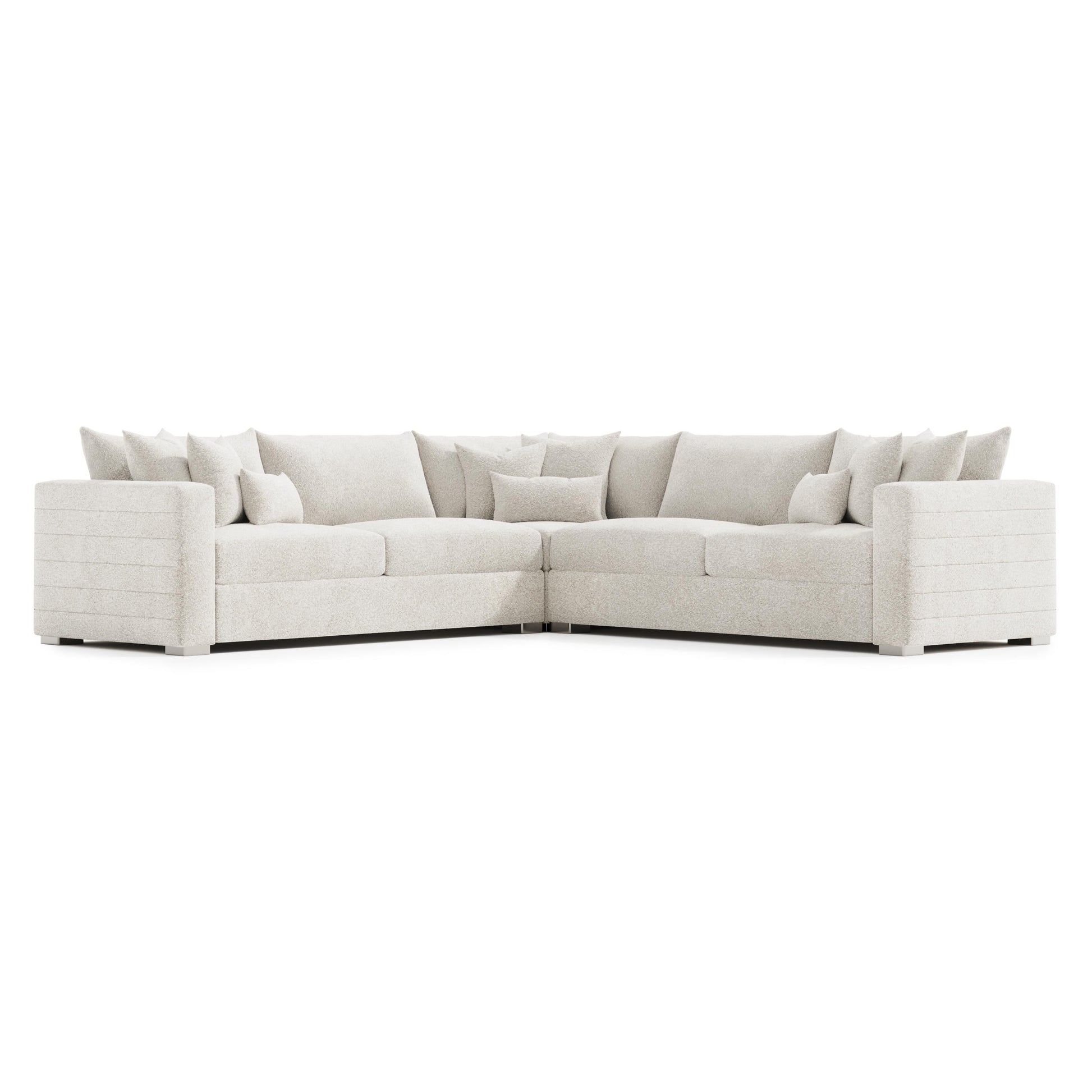 Plush yet architectural, the Helena Fabric Sectional brings a soft modern sensibility to contemporary interiors. Its low, horizontal profile and oversized track arms create a tailored silhouette, while brushed stainless steel feet introduce a refined metallic accent that keeps the look clean and elevated.