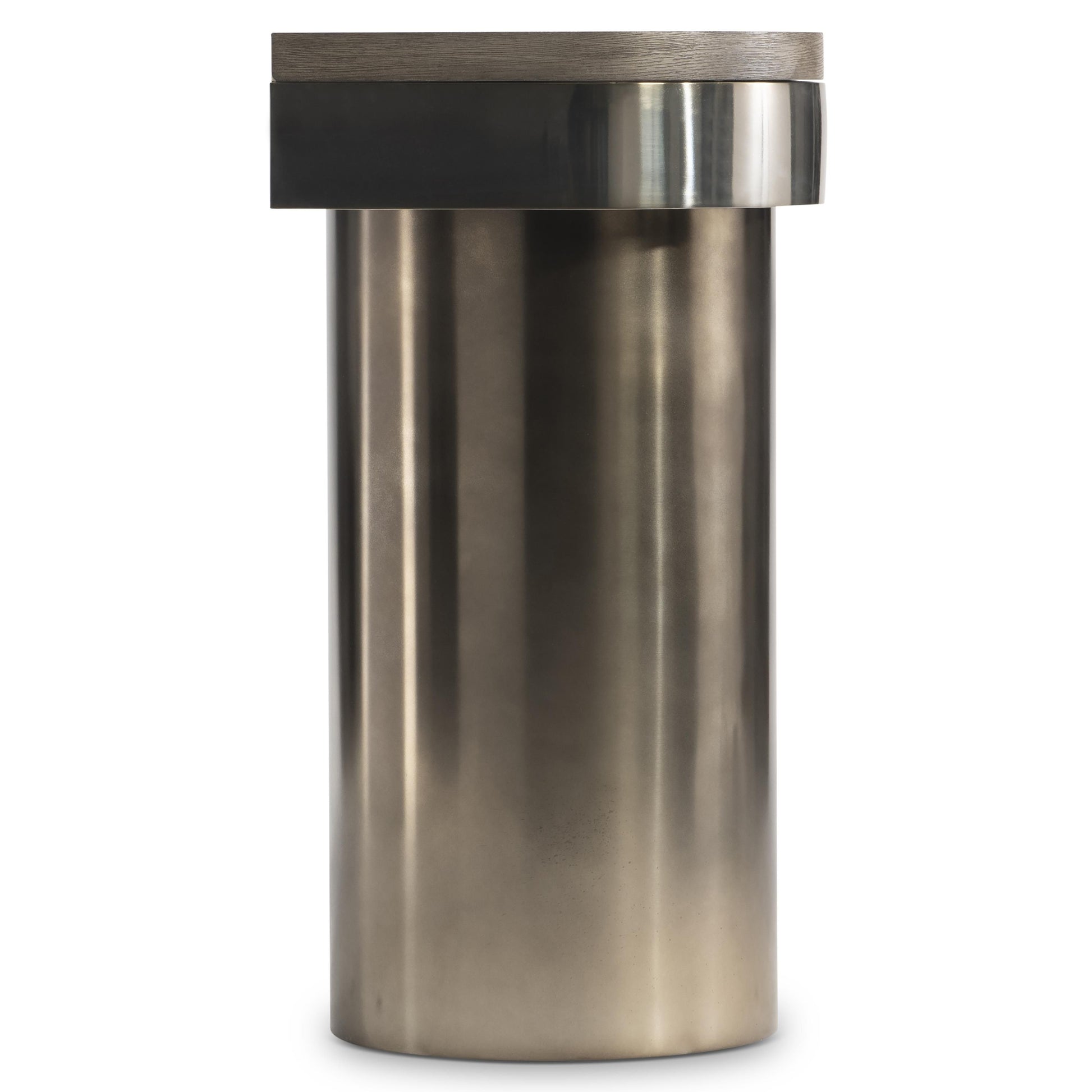 Above, a wire-brushed oak top in a Weathered Greige finish introduces warmth and texture. A polished stainless steel band in Light Bronze finish wraps the perimeter, framing the surface with a subtle metallic glow. The interplay of oak and metal highlights Bernhardt’s attention to materiality and finish, resulting in a console table that feels both modern and timeless.