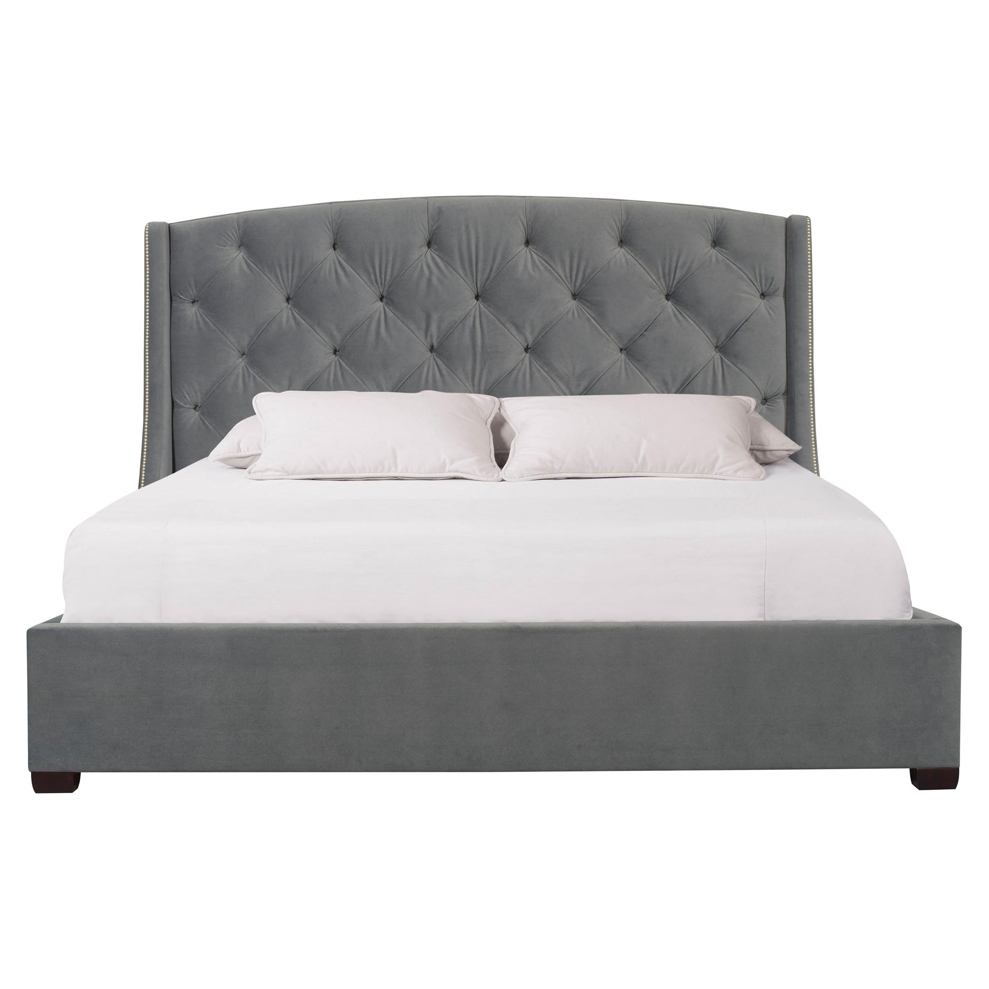 Nailhead trim traces the wings and top rail of the headboard, adding a subtle layer of craftsmanship and visual depth. The upholstered footboard and side rails maintain a clean, unadorned finish for contrast, while wood feet in an espresso finish ground the design with warmth. A slat support system ensures dependable comfort, making the Jordan bed as functional as it is sophisticated.