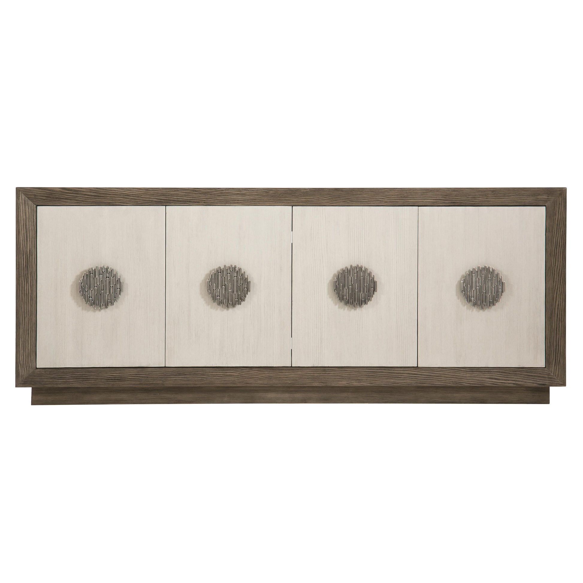 The Luca Entertainment Credenza delivers a sophisticated interpretation of classic Art Deco style, defined by clean architectural lines, ornate patterning, and luminous metallic accents. Its expansive silhouette is crafted from quartered pine veneers, finished in a striking two-tone palette that contrasts a deep Clove case with lighter Bone-finished door fronts. Sculptural round silver pulls add depth and visual intrigue, while the streamlined plinth base grounds the design with a refined, contemporary presence.