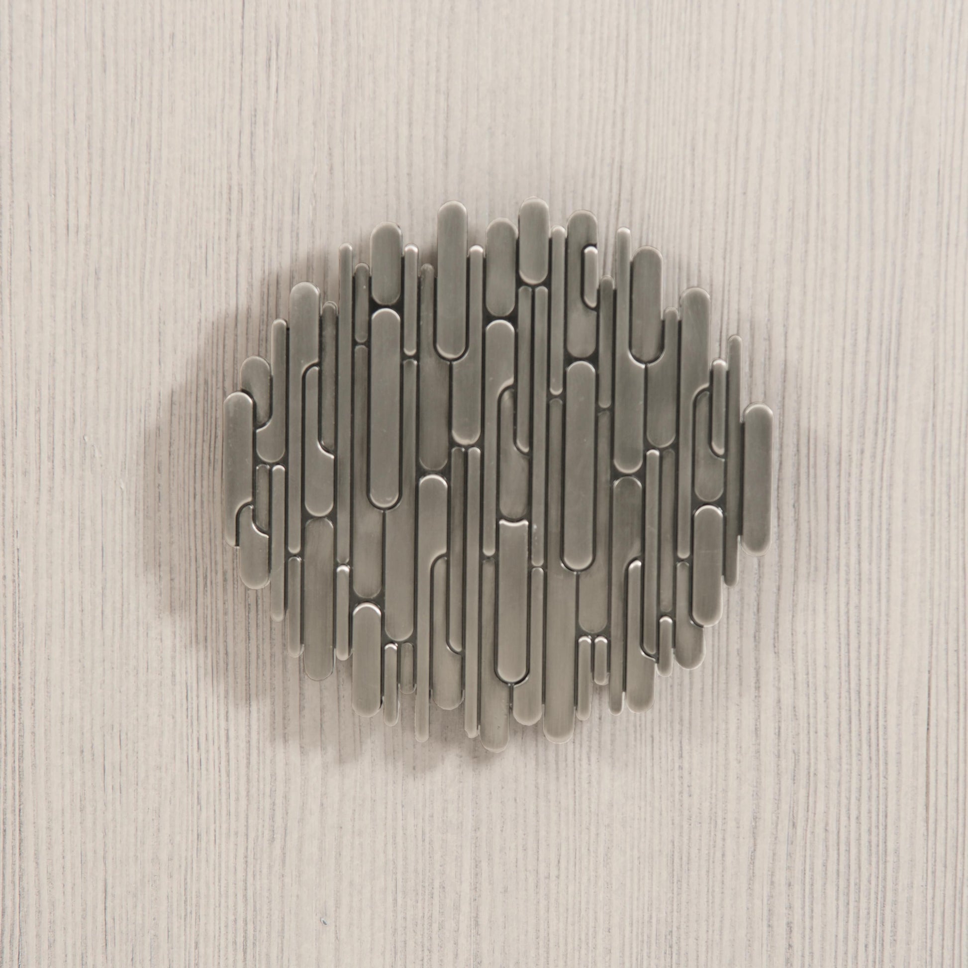 - Four touch-to-open doors with sculptural round silver pulls
