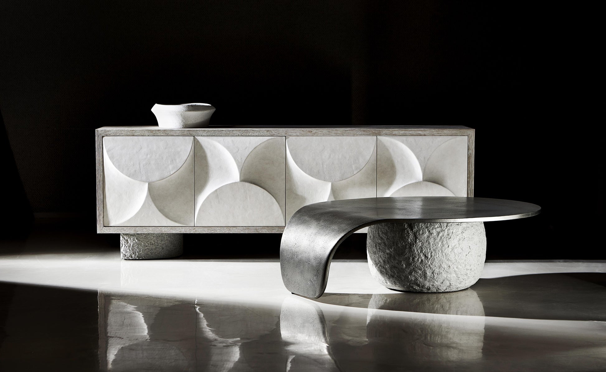 Anchoring the piece are shaped cast concrete bases finished in Sand Grey, their chiseled texture reinforcing the credenza’s elemental appeal. Designed to balance bold aesthetics with everyday function, four soft-close doors open to reveal generous storage with adjustable shelving, integrated vents, and a discreet covered grommet—ideal for housing media components while maintaining a clean, composed look.