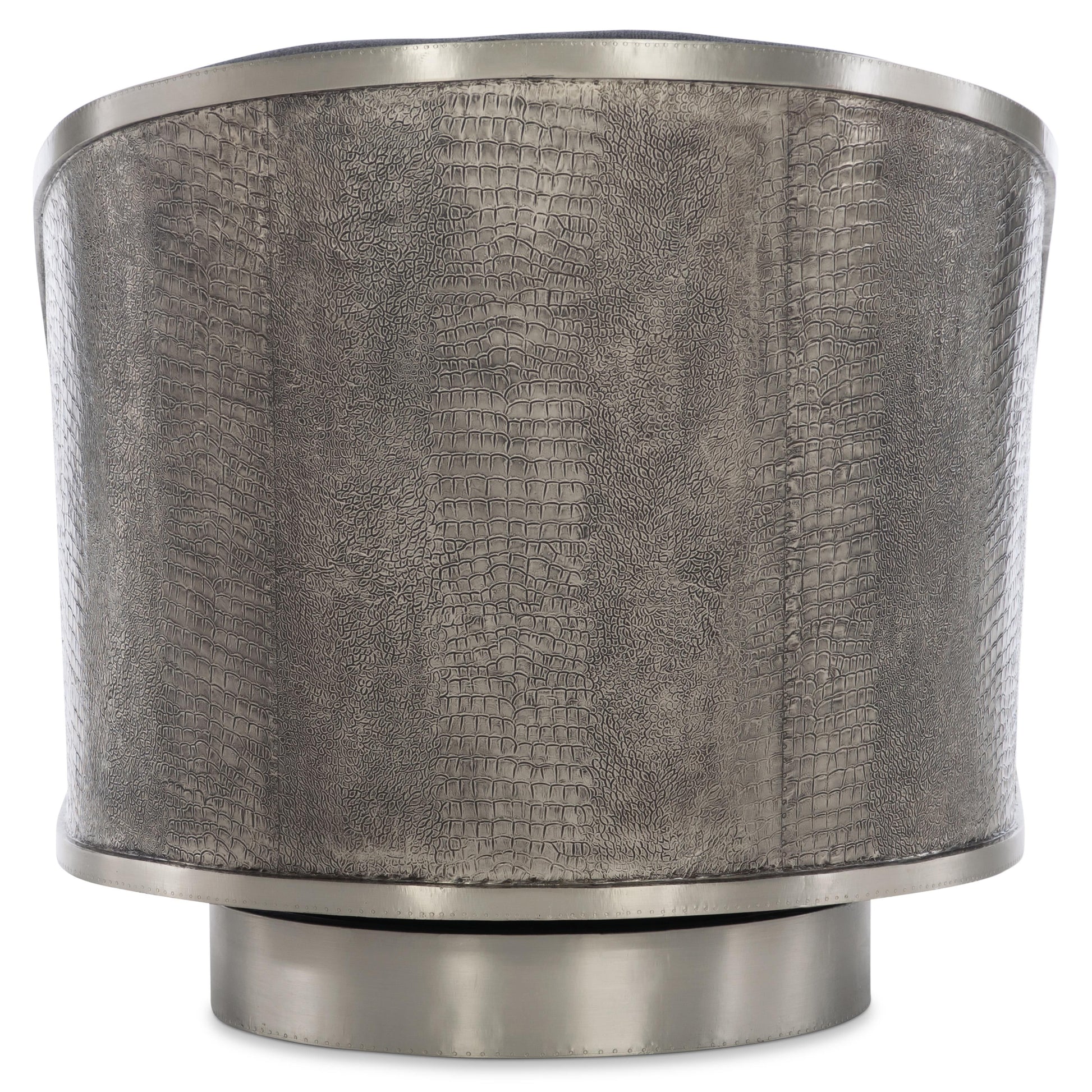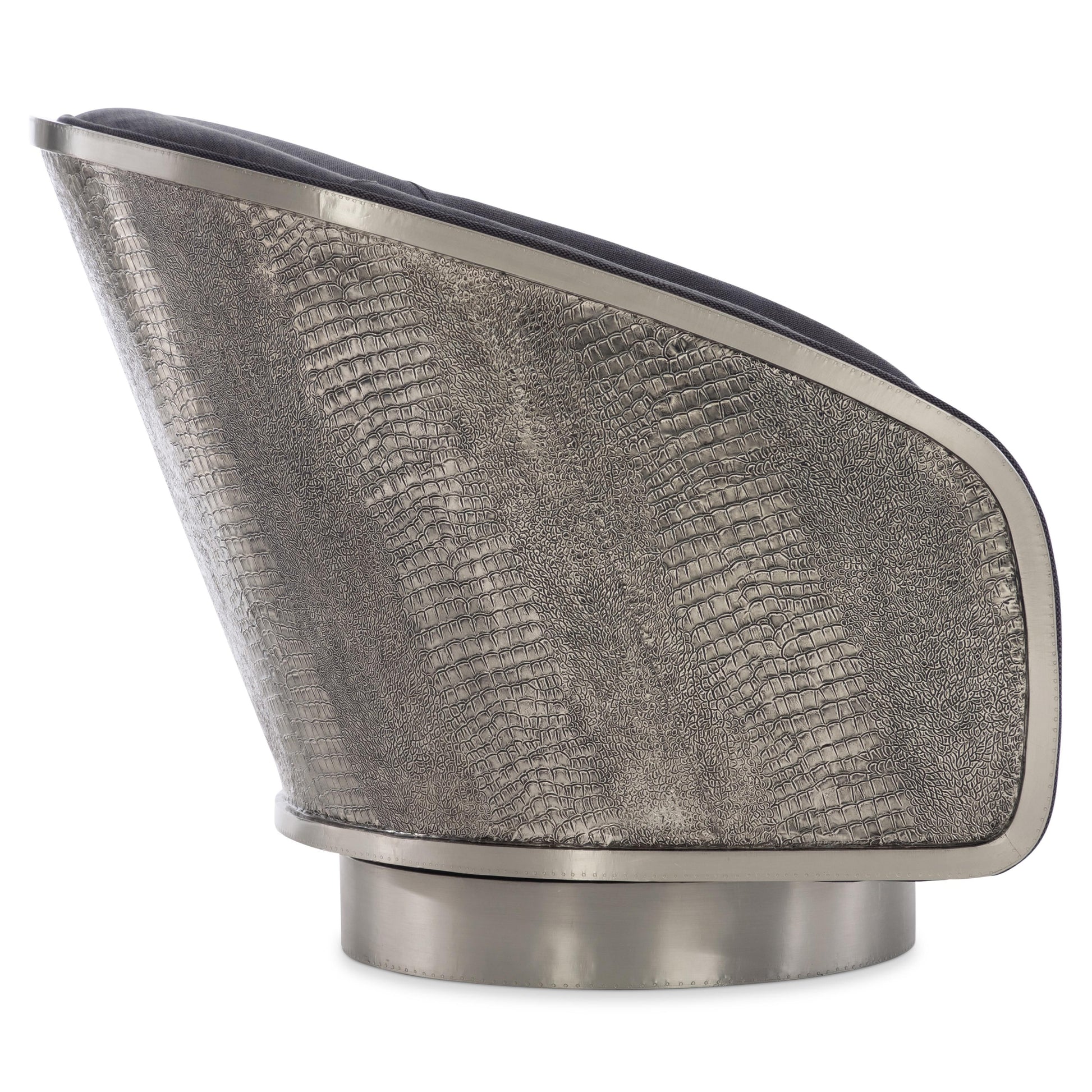 The Miles Fabric Swivel Chair presents a striking balance of sculptural metal and tailored upholstery. An aerodynamic sweep of German silver defines the chair’s silhouette, embossed with a croc pattern that adds depth, texture, and a refined sense of movement. This distinctive metal back brings a bold, contemporary edge while maintaining an elegant profile.