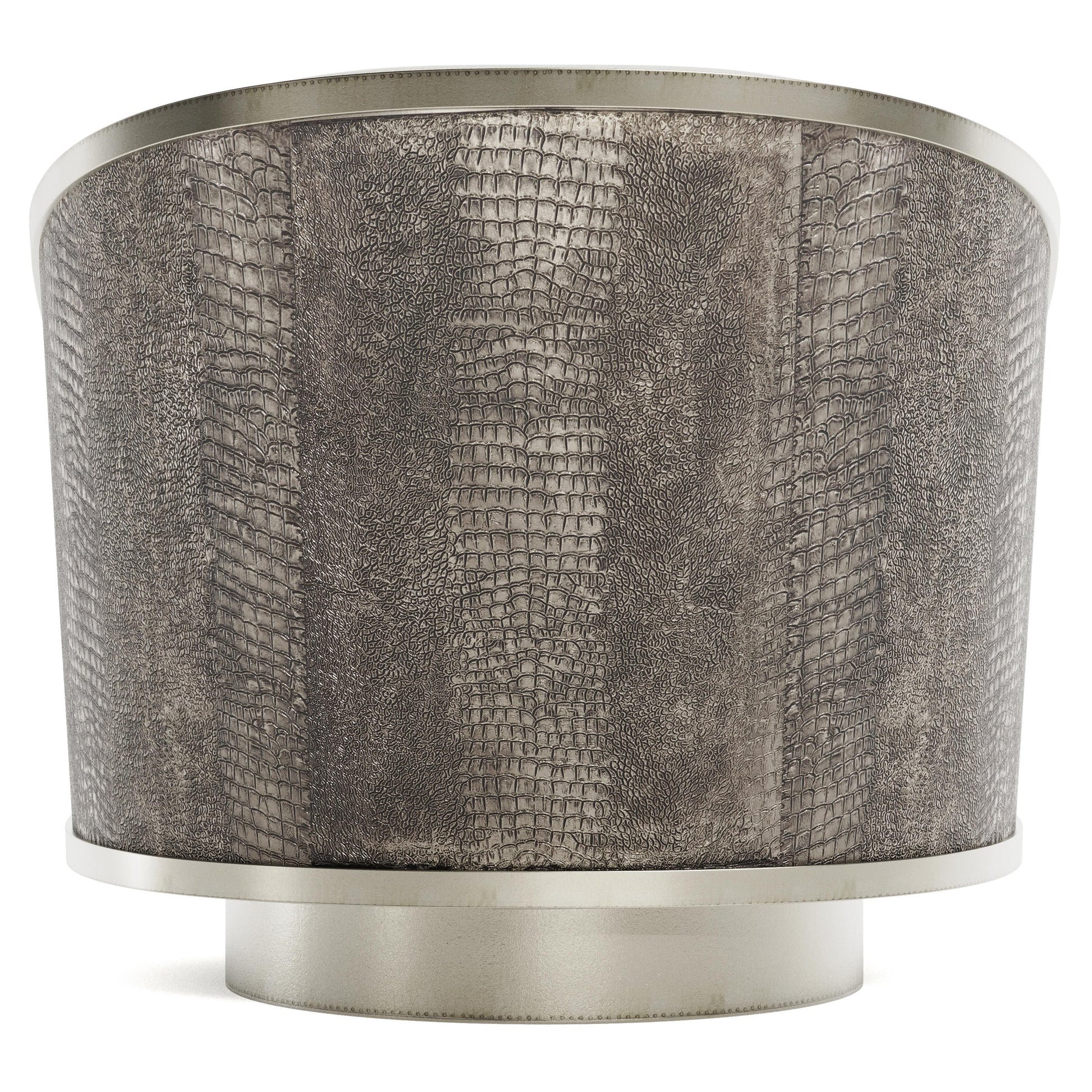 The Miles leather swivel chair is defined by a sleek, contemporary profile highlighted by an aerodynamic sweep of German silver. The chair’s sculptural back is embossed with a refined croc pattern, lending depth and visual intrigue to the luminous metal finish. This distinctive detail elevates the silhouette, making the chair as striking from the back as it is from the front.