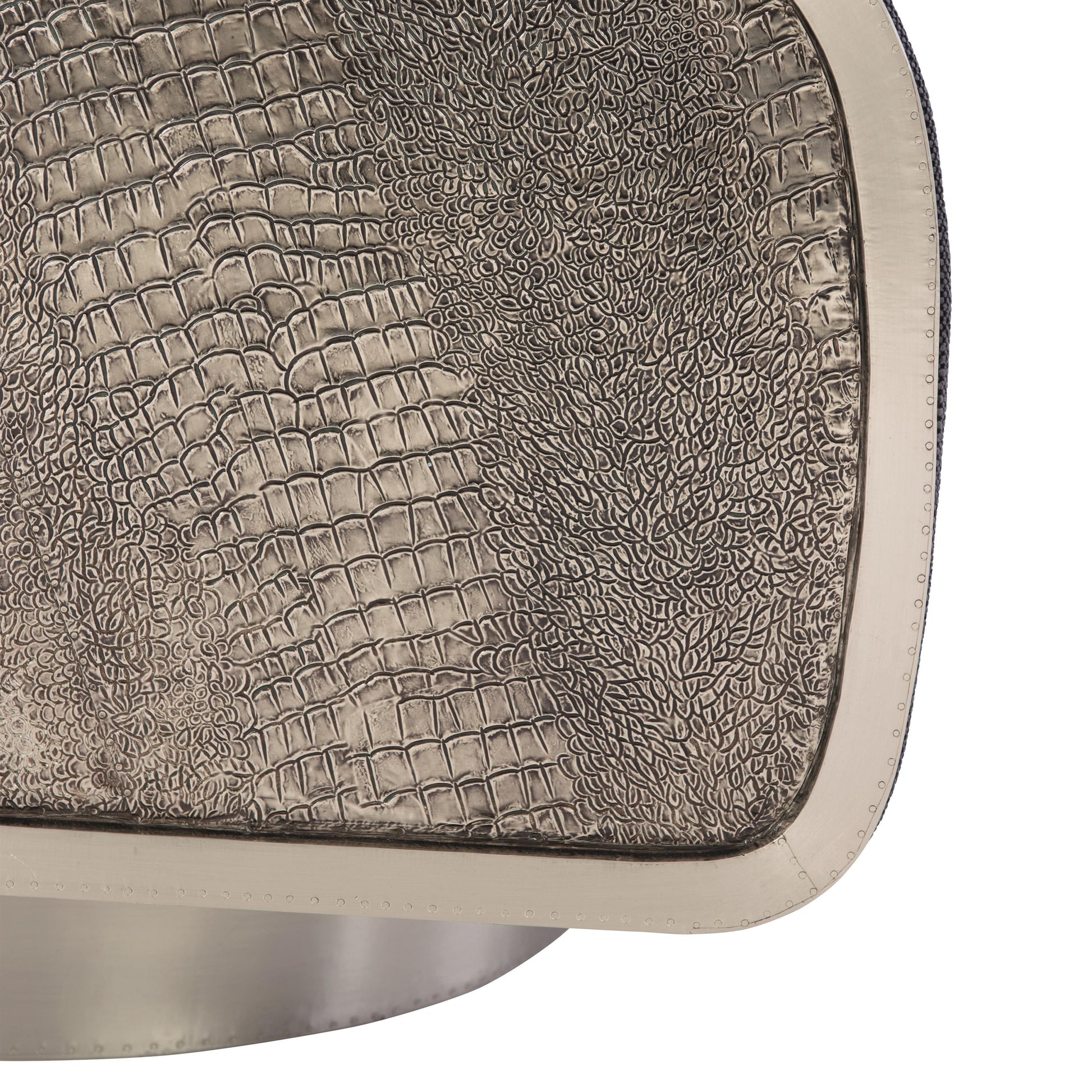 The Miles leather swivel chair makes a bold, modern statement through its sculptural form and refined materials. An aerodynamic sweep of German silver defines the outer shell, embossed with a croc pattern that adds depth and visual intrigue. This distinctive metal finish contrasts beautifully with the smooth contours of the chair, creating a look that feels both contemporary and luxurious.