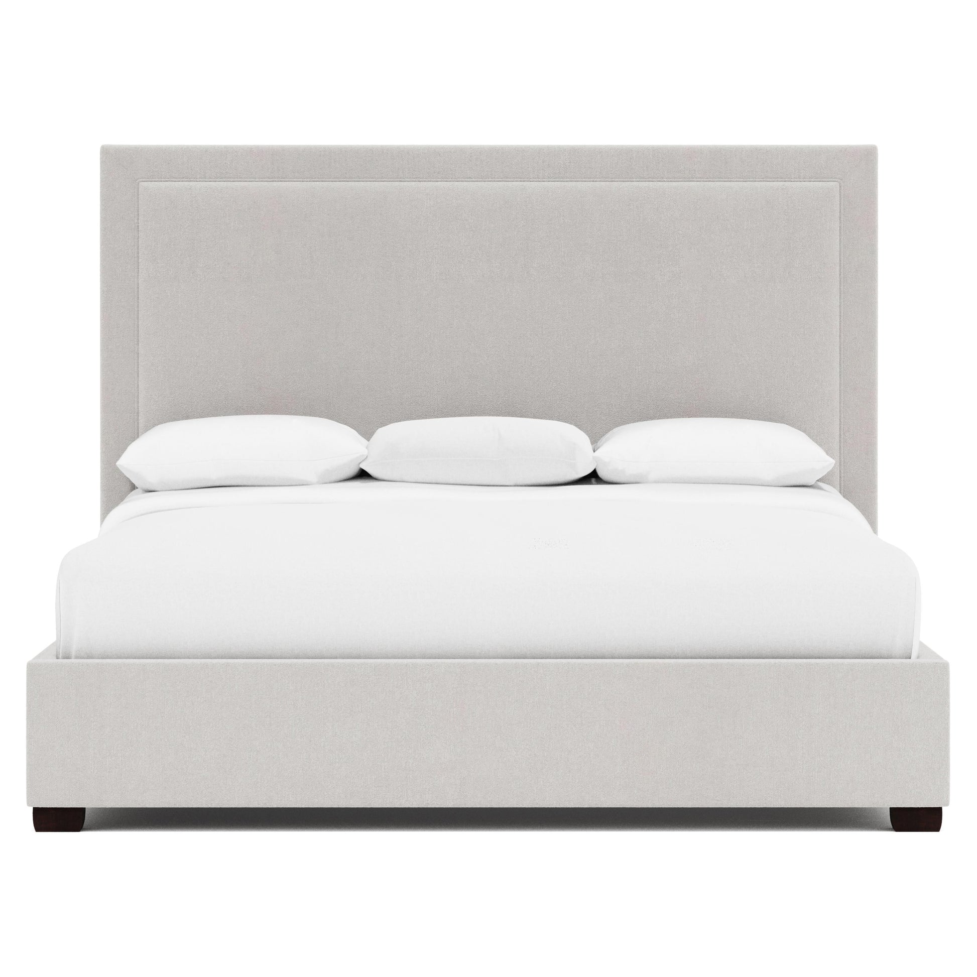 Fully upholstered footboard and side rails maintain a cohesive, softly structured look, while wooden feet ground the design with understated contrast. Offered in Espresso or Smoke finishes, the base complements a range of interior palettes. A slat support system provides a streamlined foundation, making this king-size upholstered bed as functional as it is visually composed.