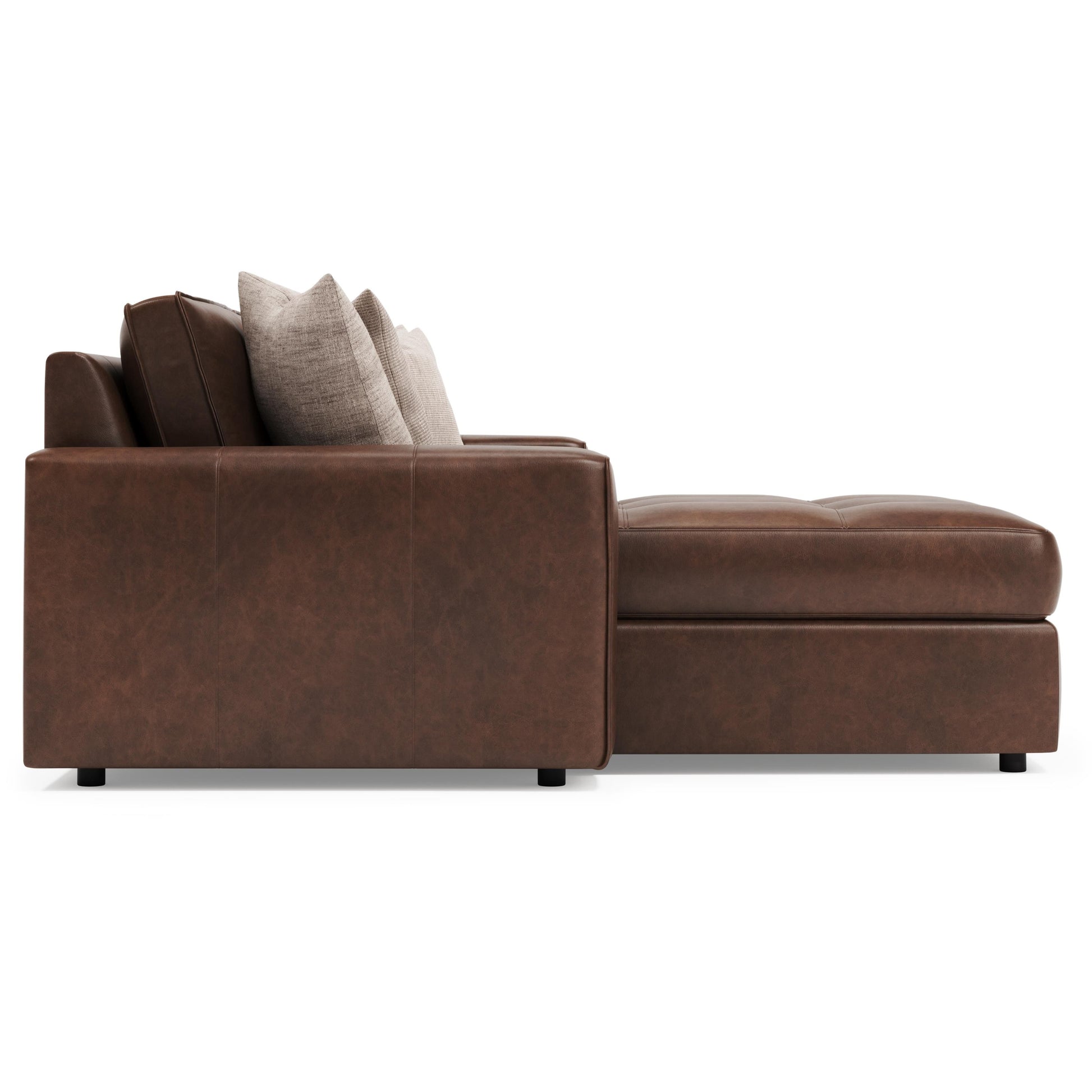 Configured with thoughtfully scaled components, the Nest sectional offers flexibility for a variety of room layouts. A left arm chaise pairs seamlessly with a right arm loveseat, creating an expansive seating arrangement that feels cohesive yet adaptable. The leather upholstery enhances the sectional’s visual depth while delivering a polished, enduring aesthetic.