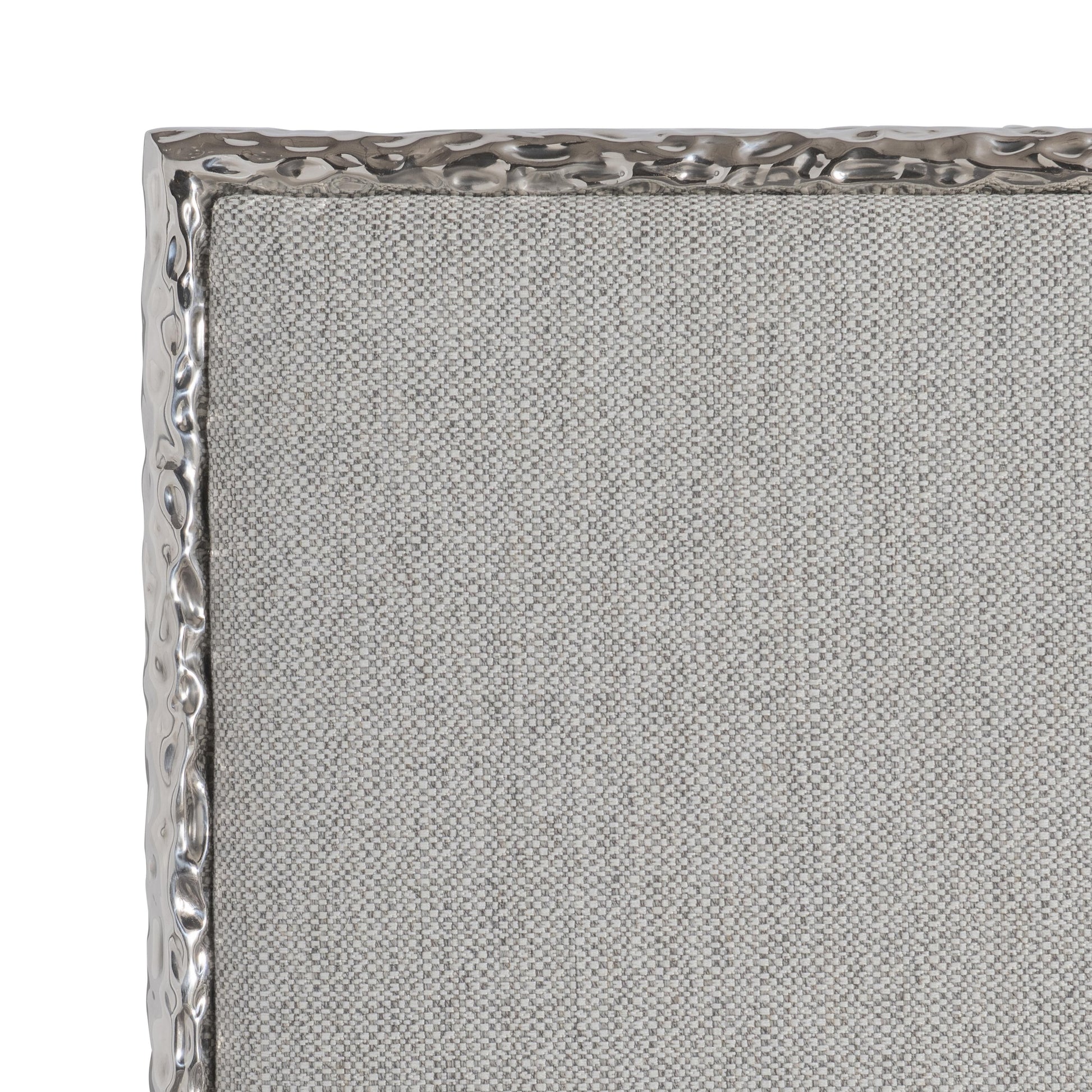 The Odette Fabric Panel Bed makes a striking statement through contrast, pairing soft upholstery with the tactile allure of hammered metal. Its minimalist silhouette allows the materials to lead, showcasing a polished stainless steel frame rendered in a luminous Nickel finish. Subtle variations in the hammered texture lend depth and character, creating a refined yet relaxed presence.