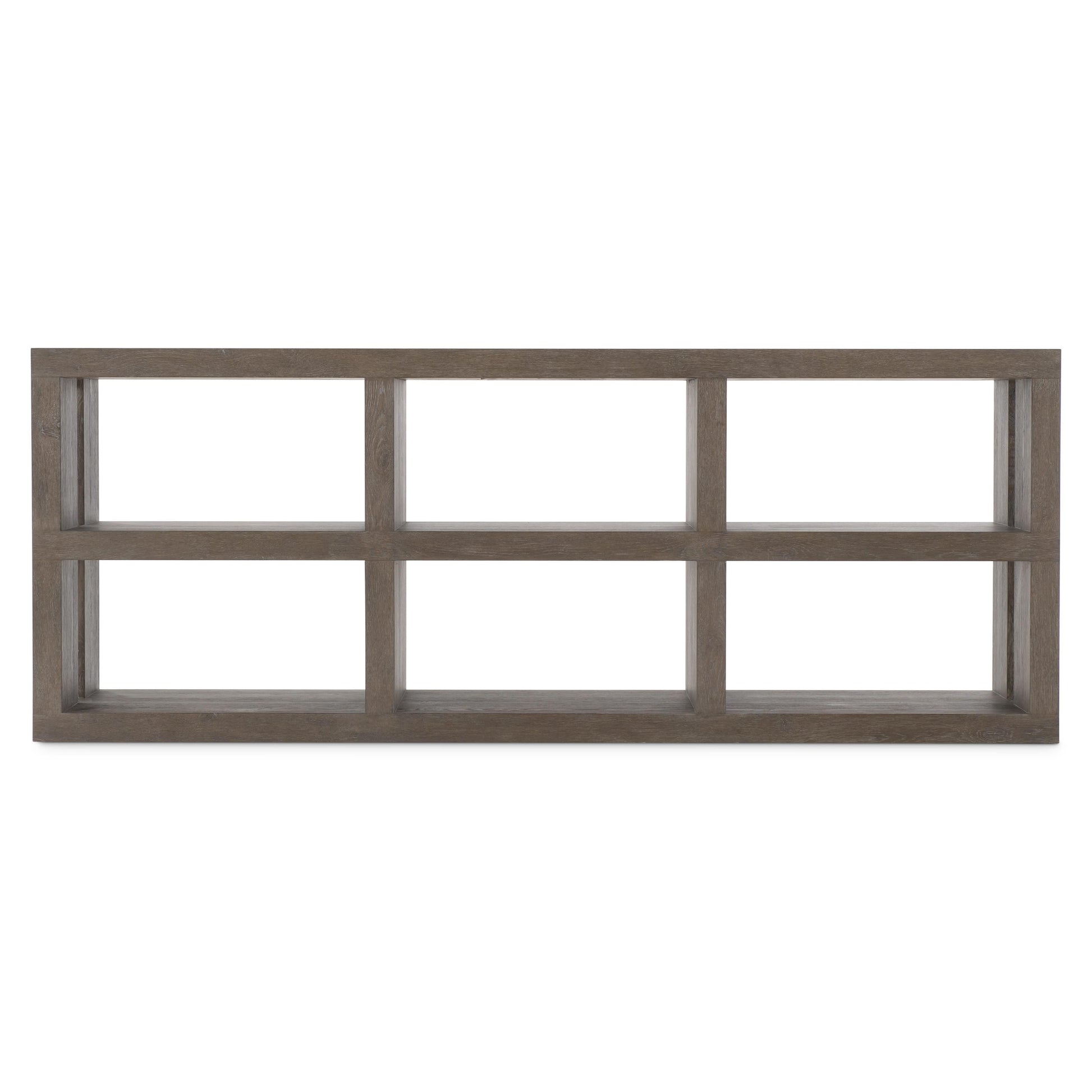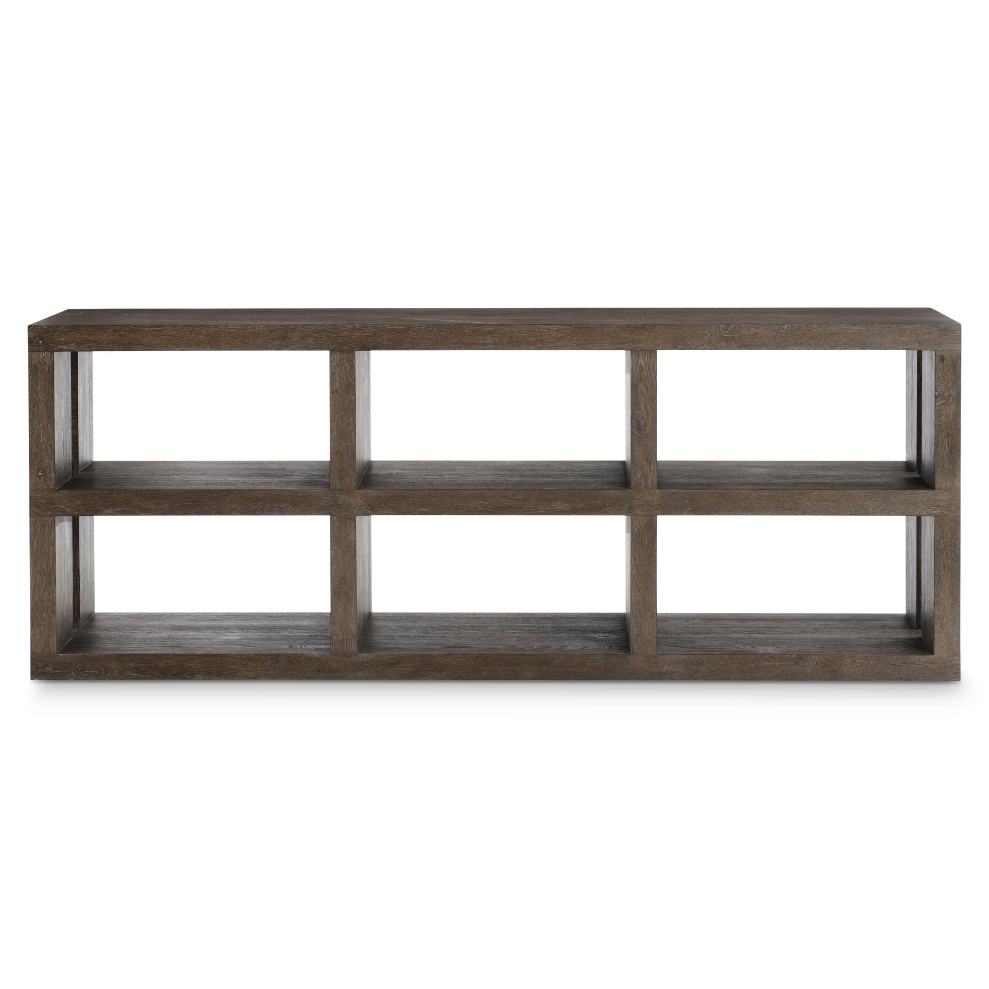 Crafted from deeply textured, wire-brushed oak, the table is finished in a rich Cassel tone that enhances the natural character of the wood. The thoughtful design offers both visual intrigue and everyday utility, with open shelving that provides functional display and storage while maintaining an airy, architectural presence. Adjustable glides and an included anti-tip kit ensure stability within a variety of interiors.