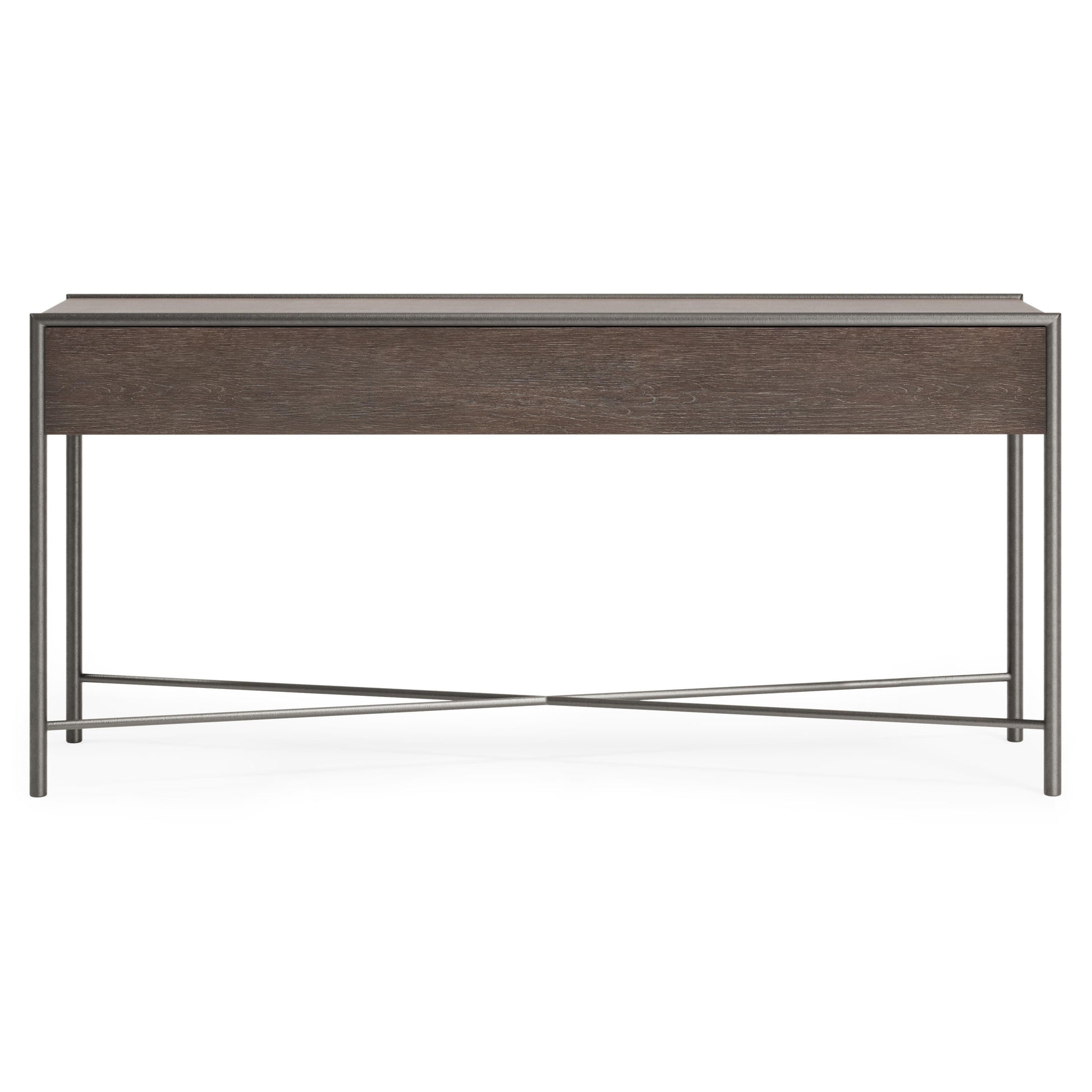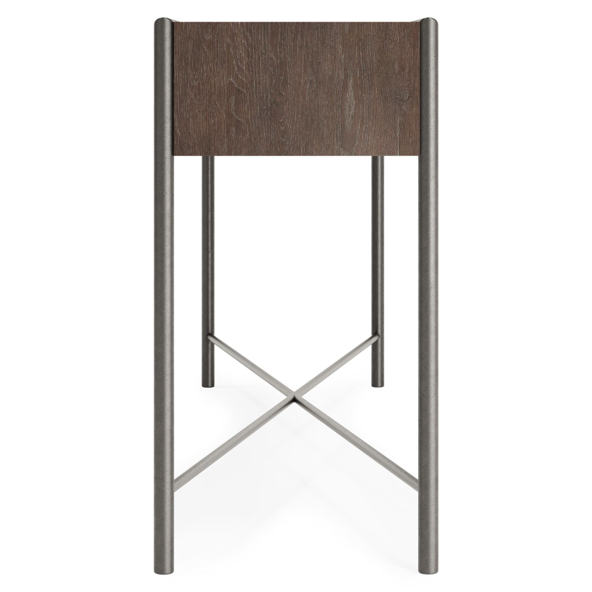 The Outline Console Table presents a modern profile defined by contrast and precision. A distinctive metal frame in an Atra finish wraps the wooden top, creating a sculptural silhouette that feels both architectural and refined. The wire-brushed oak surface, finished in Cassel, adds warmth and texture, balancing the strength of the steel with natural character.