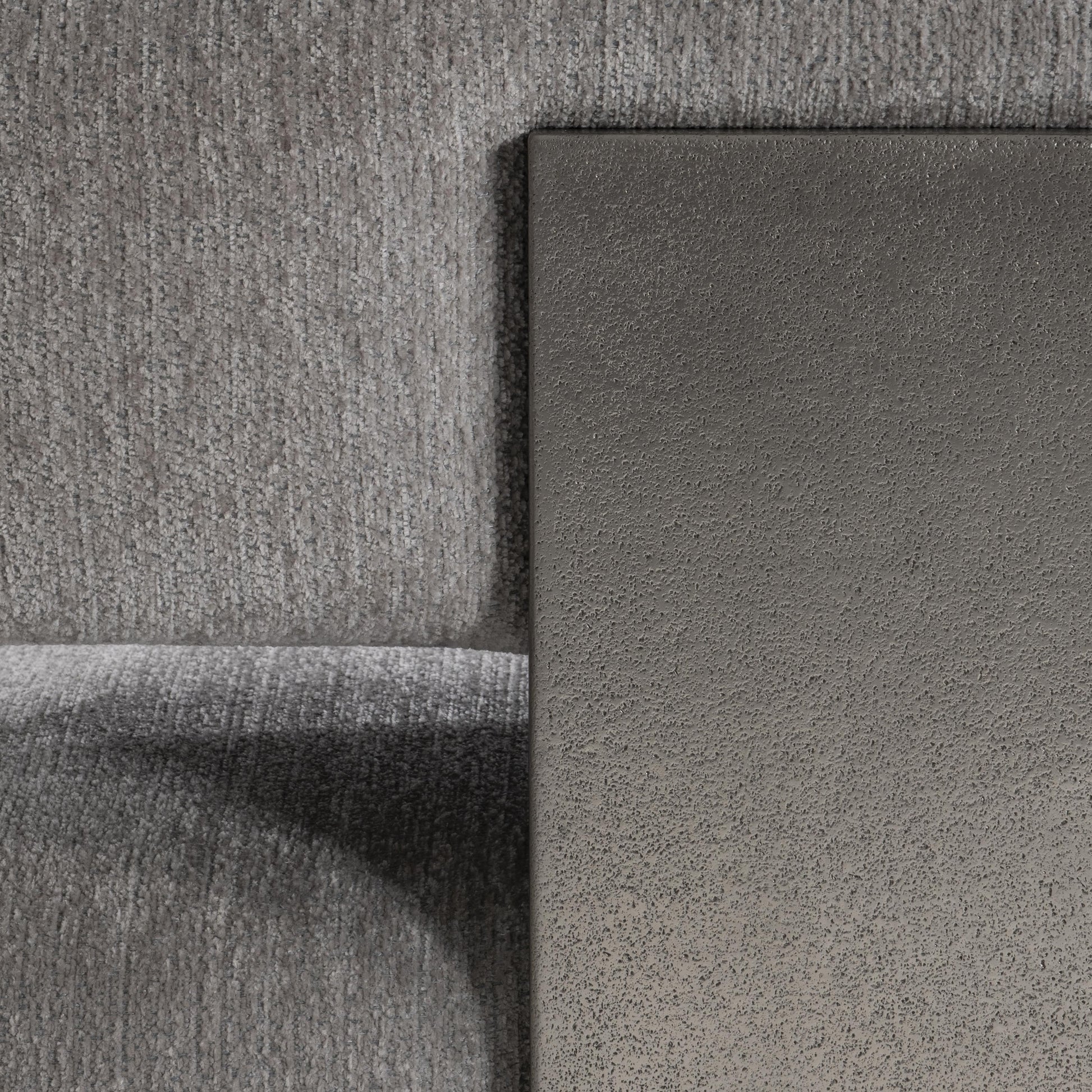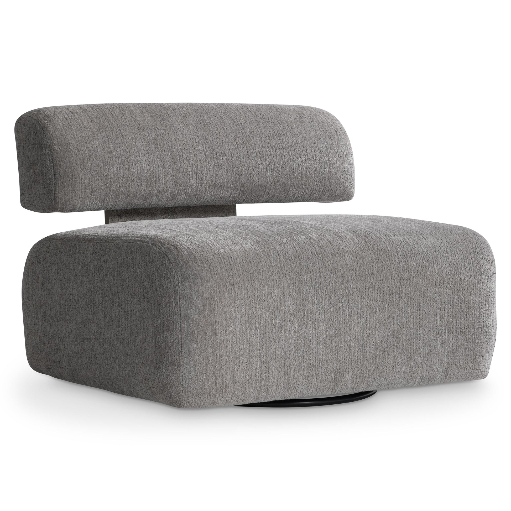 The Paley Fabric Swivel Chair balances sculptural form with modern refinement. Curving upholstered shapes are artfully composed so the back appears to float above a deep, inviting seat, creating a sense of lightness despite its substantial presence. A subtle glimpse of silver introduces a refined contrast, lending an air of modern mystery to the overall design.