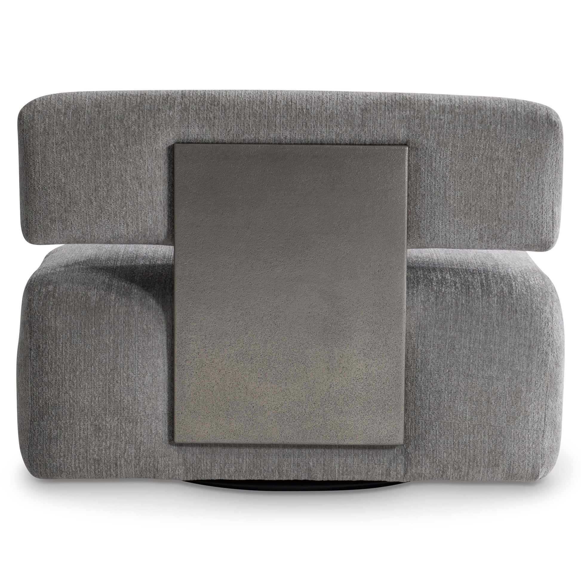 A textured metal panel discreetly connects the upholstered elements along the back, showcasing thoughtful craftsmanship and visual intrigue. Resting on a smooth swivel base, the chair offers effortless movement while maintaining a low, contemporary profile that feels both comfortable and strikingly elegant.