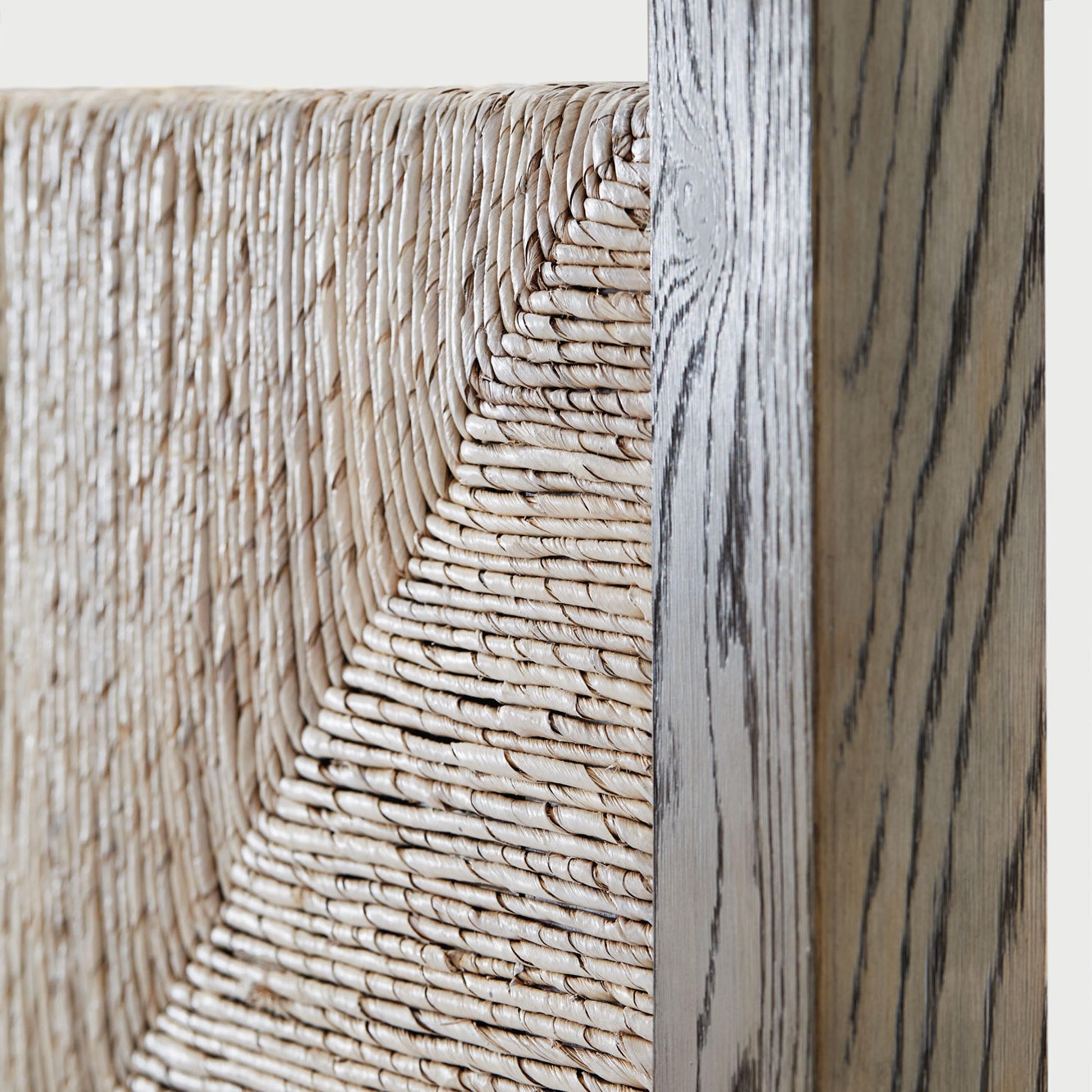 An oak-framed headboard and footboard are inset with woven abaca panels in a soft gray wash, adding depth and tactile warmth. Rustic Grey-finished white oak veneers extend through the canopy and side rails, while tubular steel collars and brackets introduce a subtle industrial note in Tarnished Nickel. Designed with a slat support system, the Palma canopy bed balances visual impact with everyday functionality.