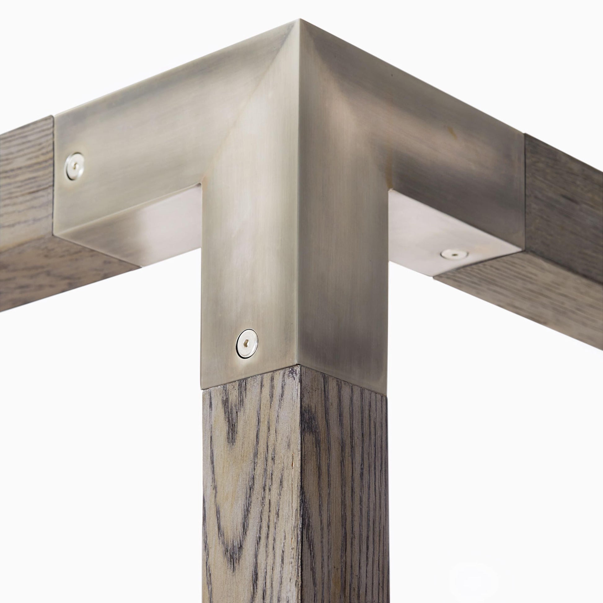 An upholstered headboard and footboard panel in a soft light gray wash bring tactile contrast to the oak frame, balancing tailored comfort with natural texture. Tubular steel collars and brackets in a tarnished nickel finish add a subtle industrial edge, offering a sophisticated counterpoint to the wood canopy and rails. Designed with both beauty and performance in mind, the Palma bed is a striking anchor for a luxury bedroom retreat.